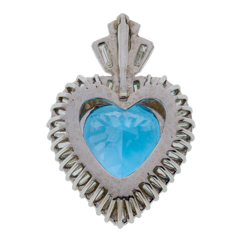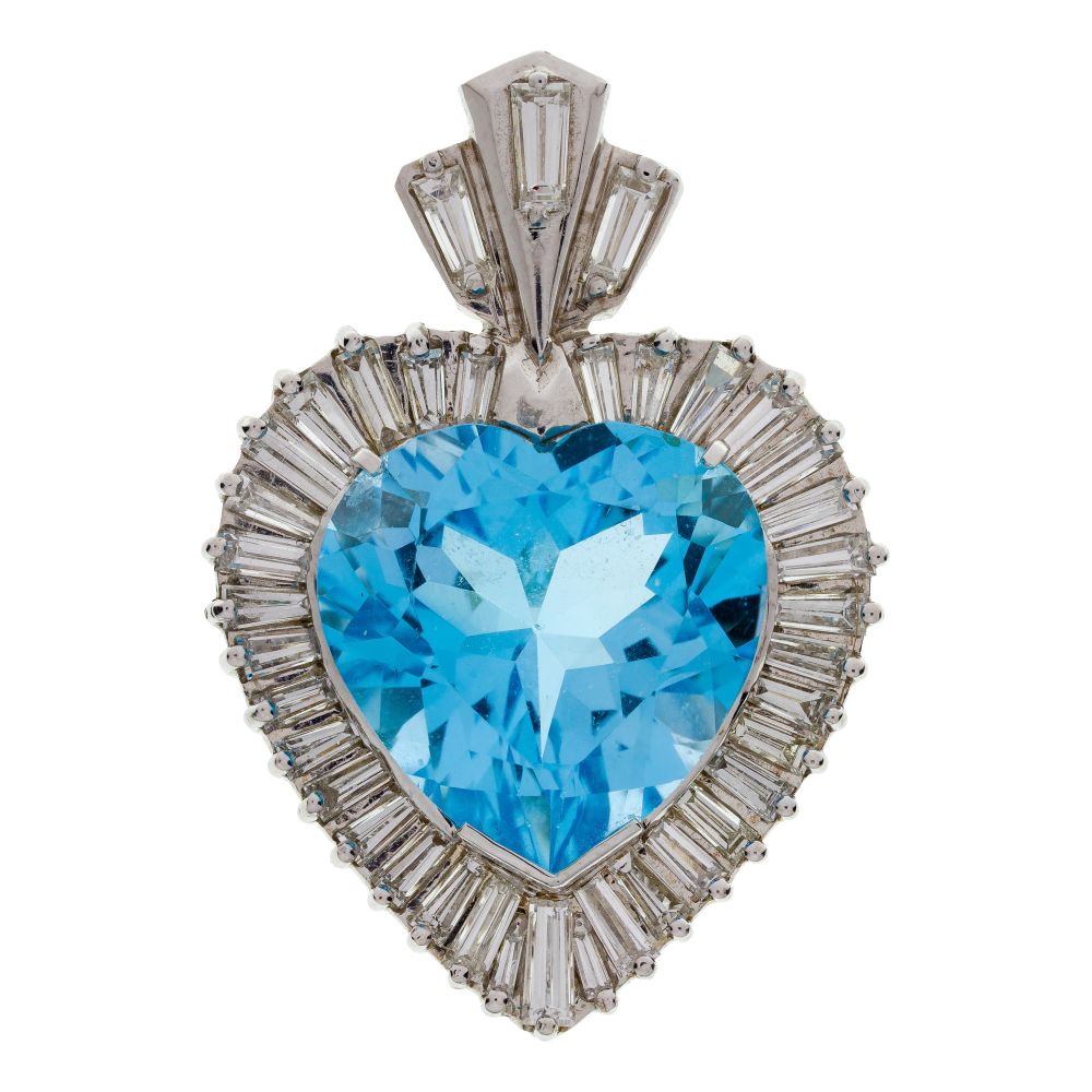 Having a heart cut blue topaz (approximately 16.7 x 16.2 x 9.7mm) surrounded by approximately thirty-eight tapered baguette cut diamonds (marked “14k”)