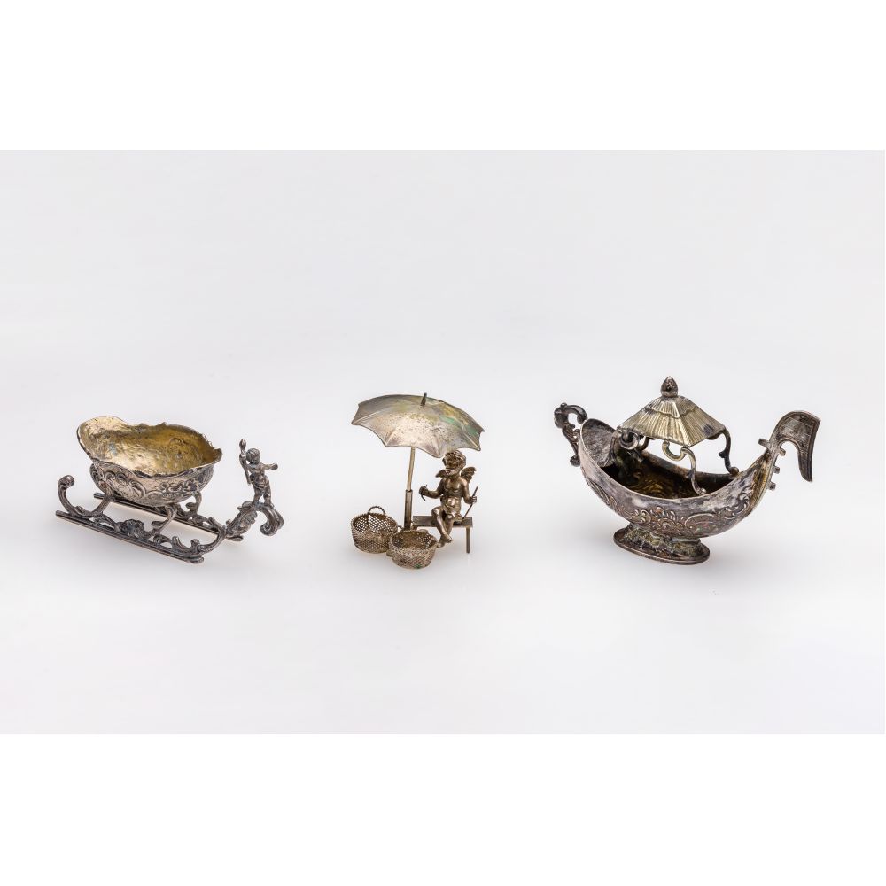 (3) items including a cherub, a sleigh and a boat (marked “800”, unmarked 0.875)