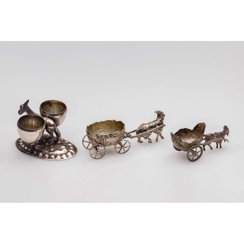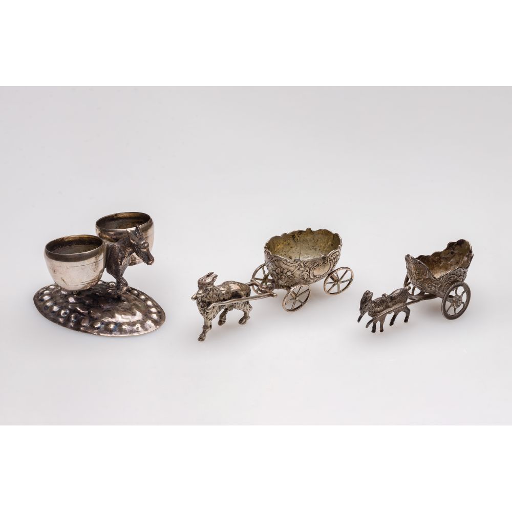 (3) items including (2) goats with carts (unmarked 0.925) and an Italian silver double cellar, in the form of a donkey carrying two barrels (marked “800”)