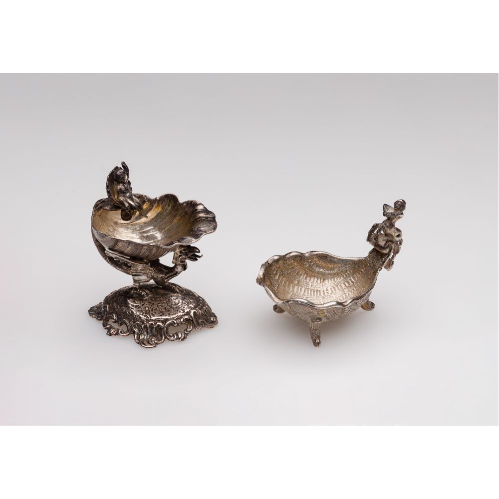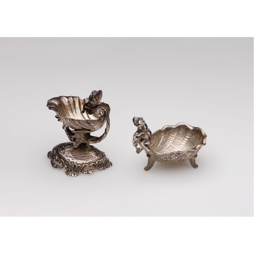 (2) items including a shell style having a centaur accent (marked “sterling”) and a putti over a shell having a dragon base (illegible markings, unmarked 0.900)