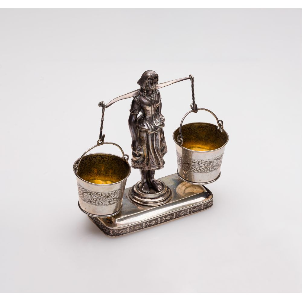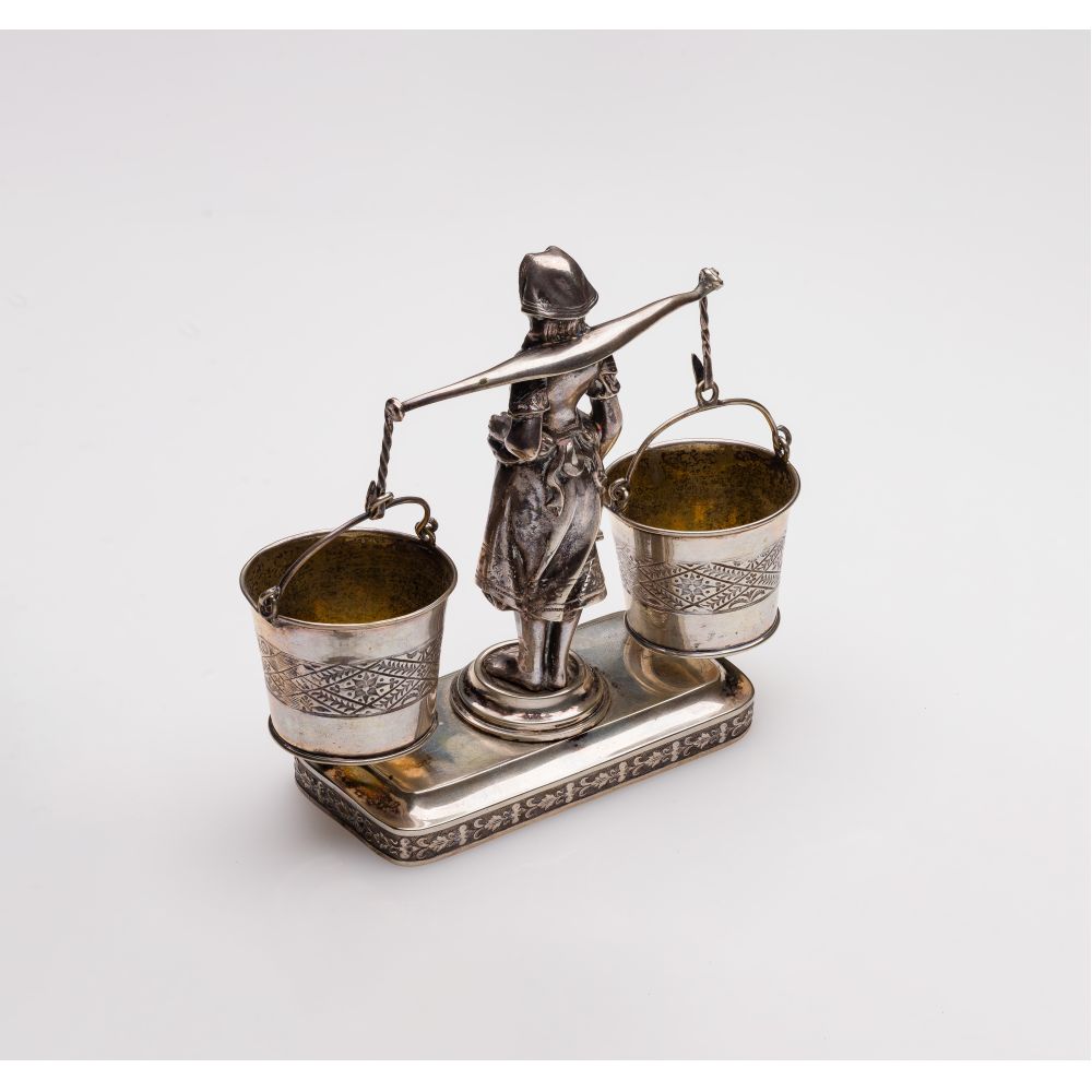 A figural cellar having a bar maiden carrying two buckets with a yoke (unmarked 0.925 and 0.830)