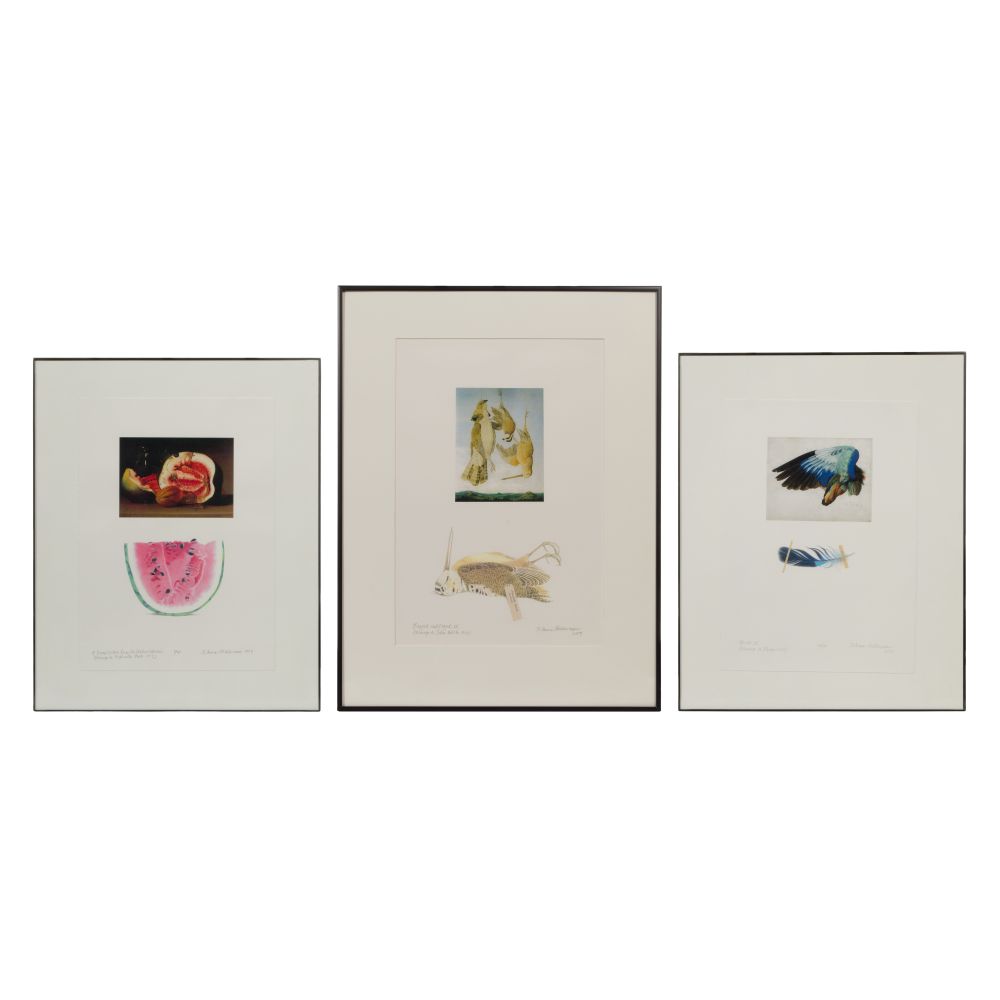 (3) prints, all signed lower left including 2009 “Bagged and Tagged IV (Homage to John Wilde)” depicting birds after a hunt, 2010 “Moult VI” #4/30 and 2009 “A Cross Section from the Watermelon Collection” 2/30, all matted under acrylic in black frames