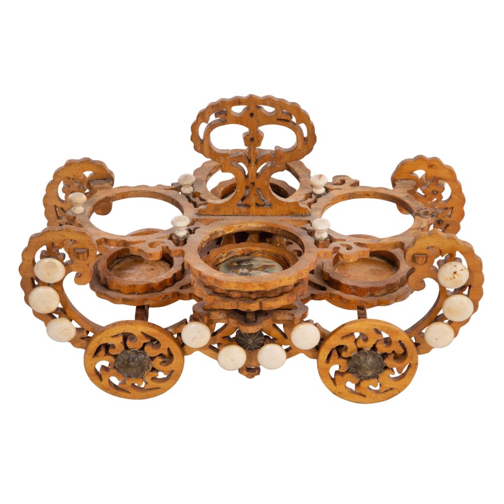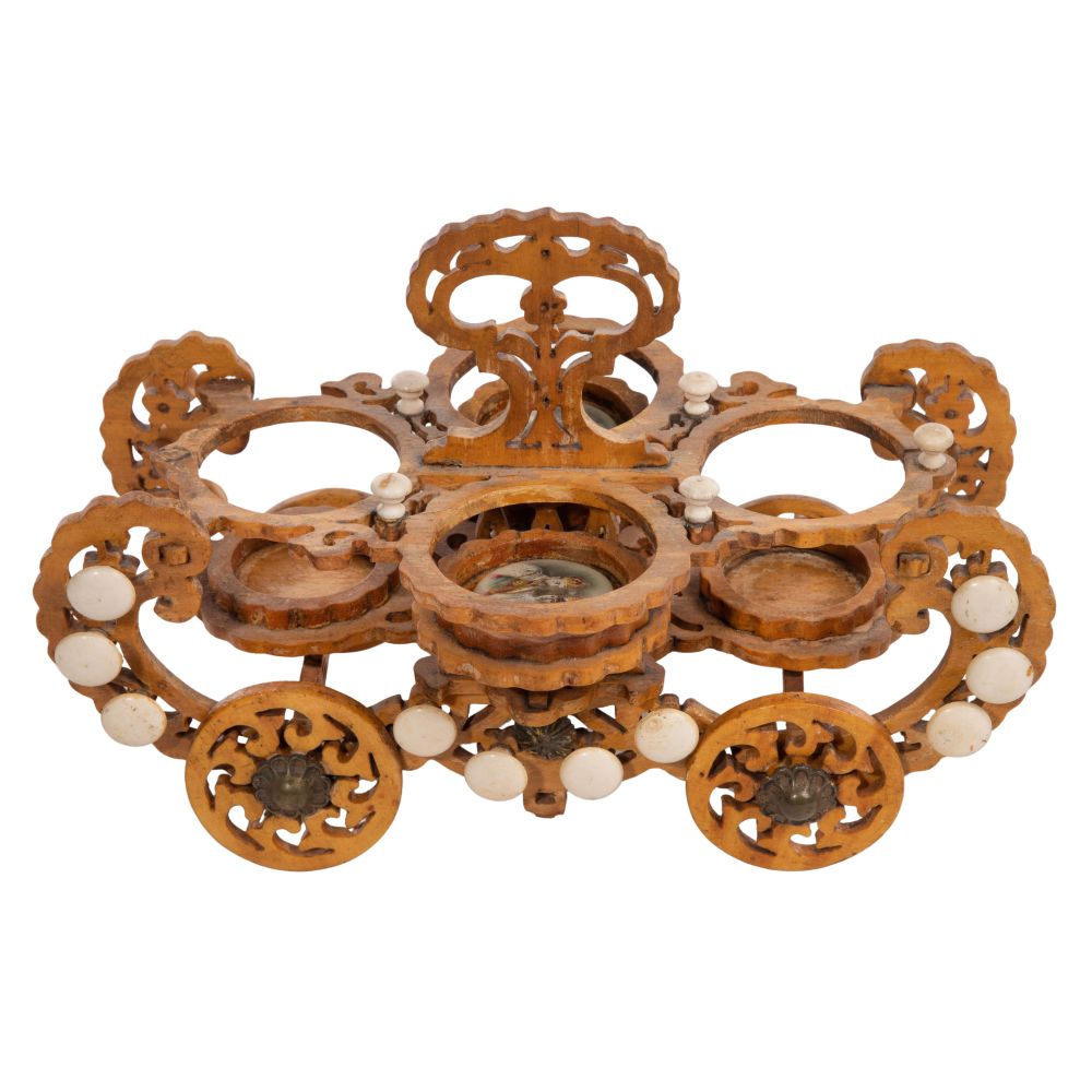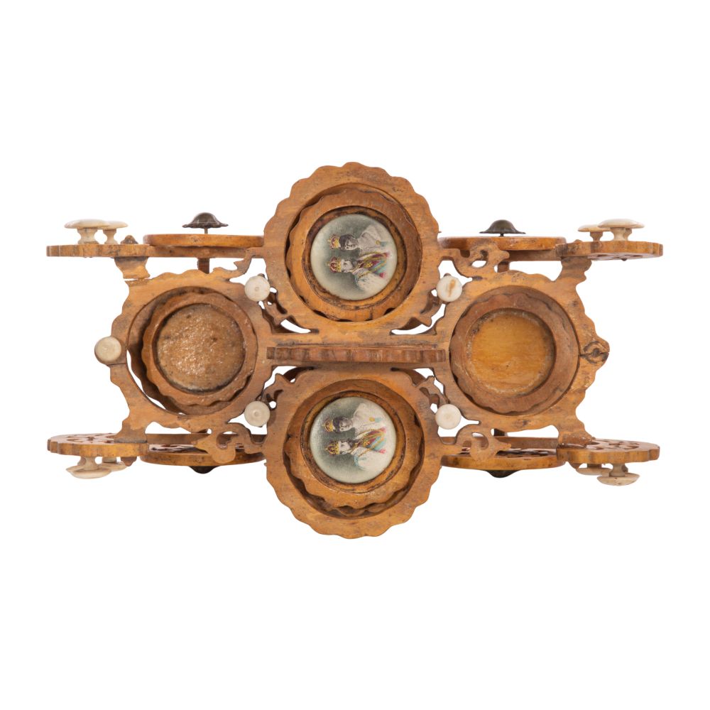 Unmarked, scroll sawn wood construction having turned bone attachments and two celluloid over offset printed buttons depicting the 1902 coronation of British King Edward VII and Queen Alexandra inserted into two of four receptacles