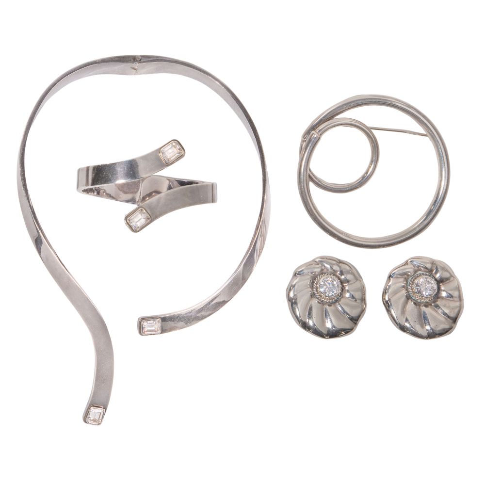 (20) total items including a set having a necklace and bracelet adorned with crystals (marked “TO-27”, “Alicia” and “950”), a circular pin and a pair of clip-on earrings (unmarked 950) as well as (3) necklaces, (2) pins and (10) pairs of clip-on earrings (all marked “925” / “sterling”); together with (2) copper bracelets