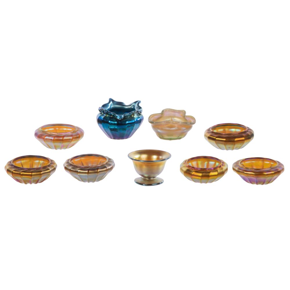 (9) items including a set of (6) favrile open cellars marked “Quezal”, a blue Aurene marked “Stueben”, a golden Aurene marked “Aurene” and a golden iridescent marked “301”