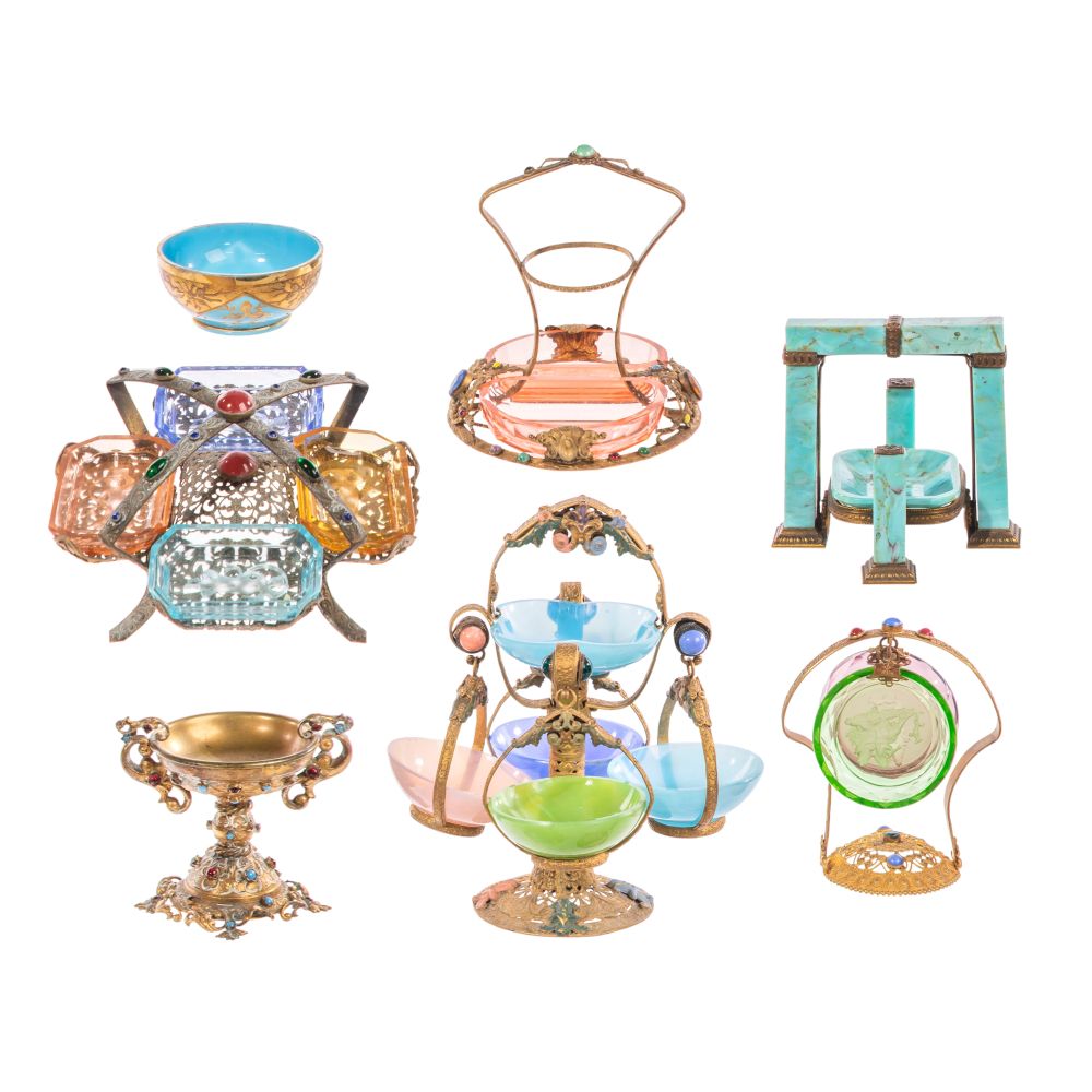 (7) items of various shapes, sizes and materials, including some glass, jeweled, gilt and brass holders, intaglio glass open cellars, some having gilt