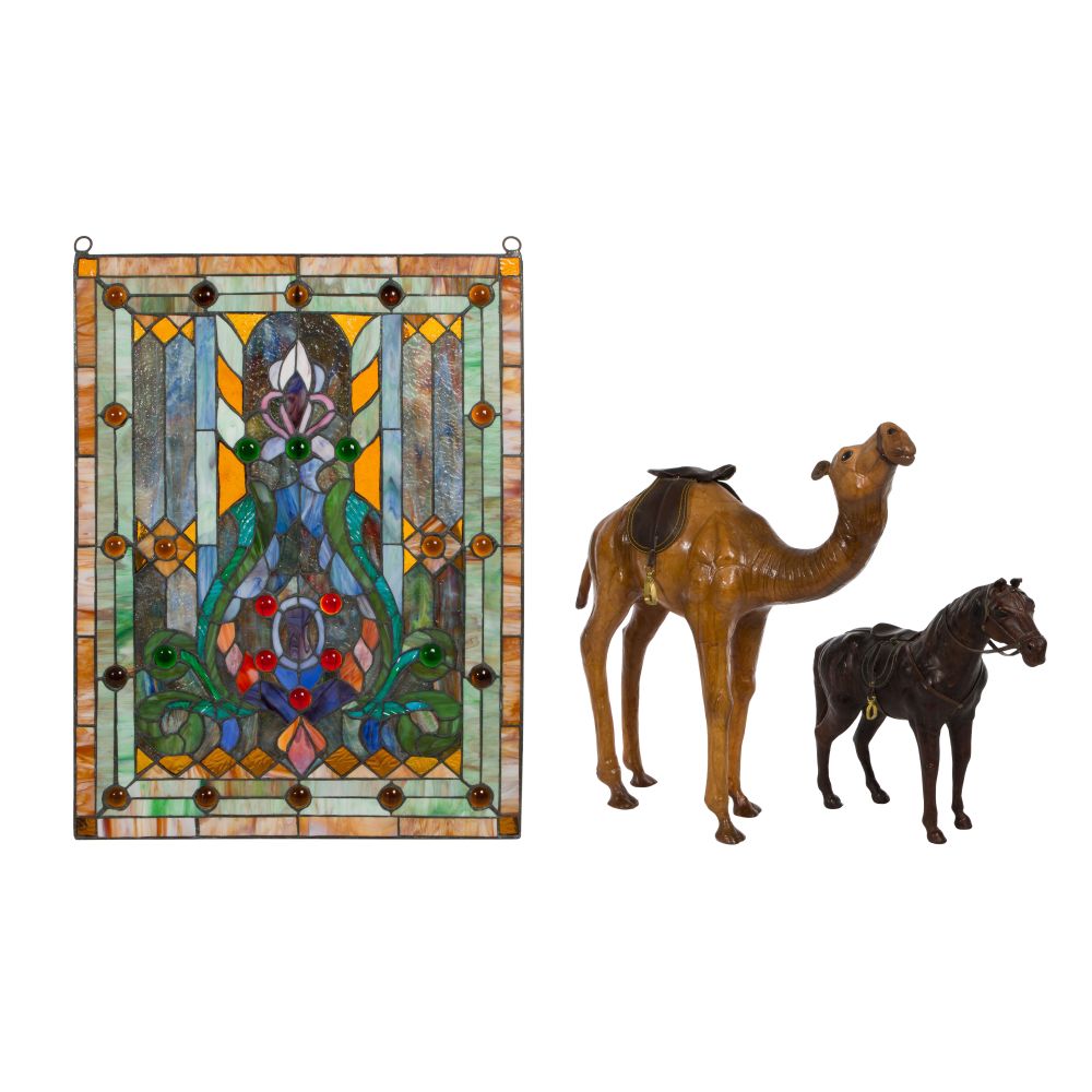 (3) items including (2) leather wrapped animal figures of a horse and a camel as well as a stained glass window insert