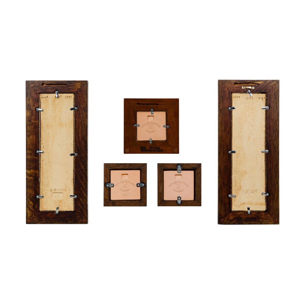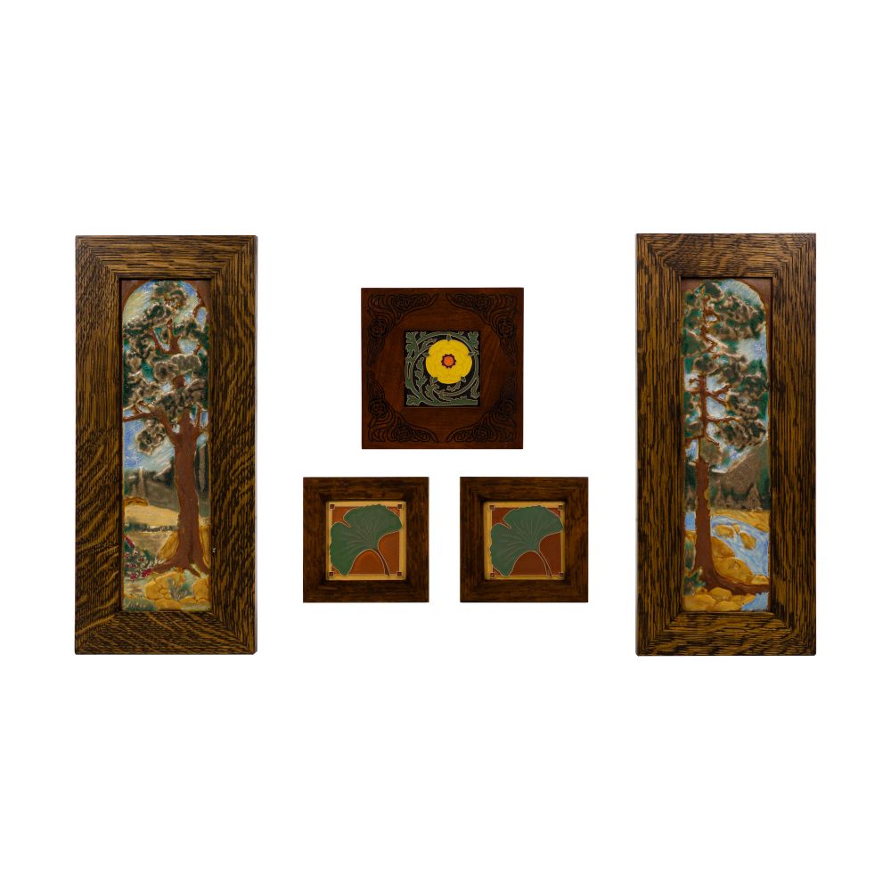 (5) total items including (3) glazed pottery tiles having impressed “Arts and Craftsman / Tileworks” mark on back, all in wood frames, one frame having laser cut scroll decoration and “Fritz Volke / artsandcraftsman.com” on back; together with (2) JMJ Tile tree tiles having impressed marks on back and wood frames