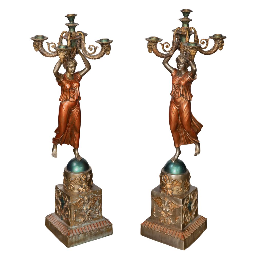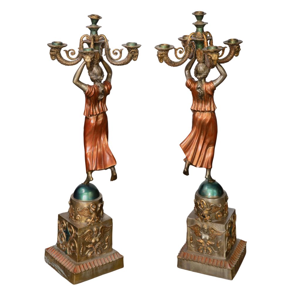 A pair of cold painted five-light candelabras having rams head form arms supported by a figure balancing atop a sphere