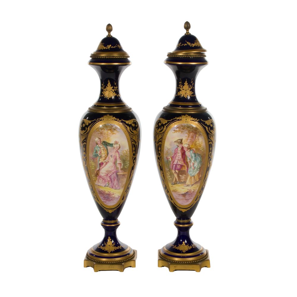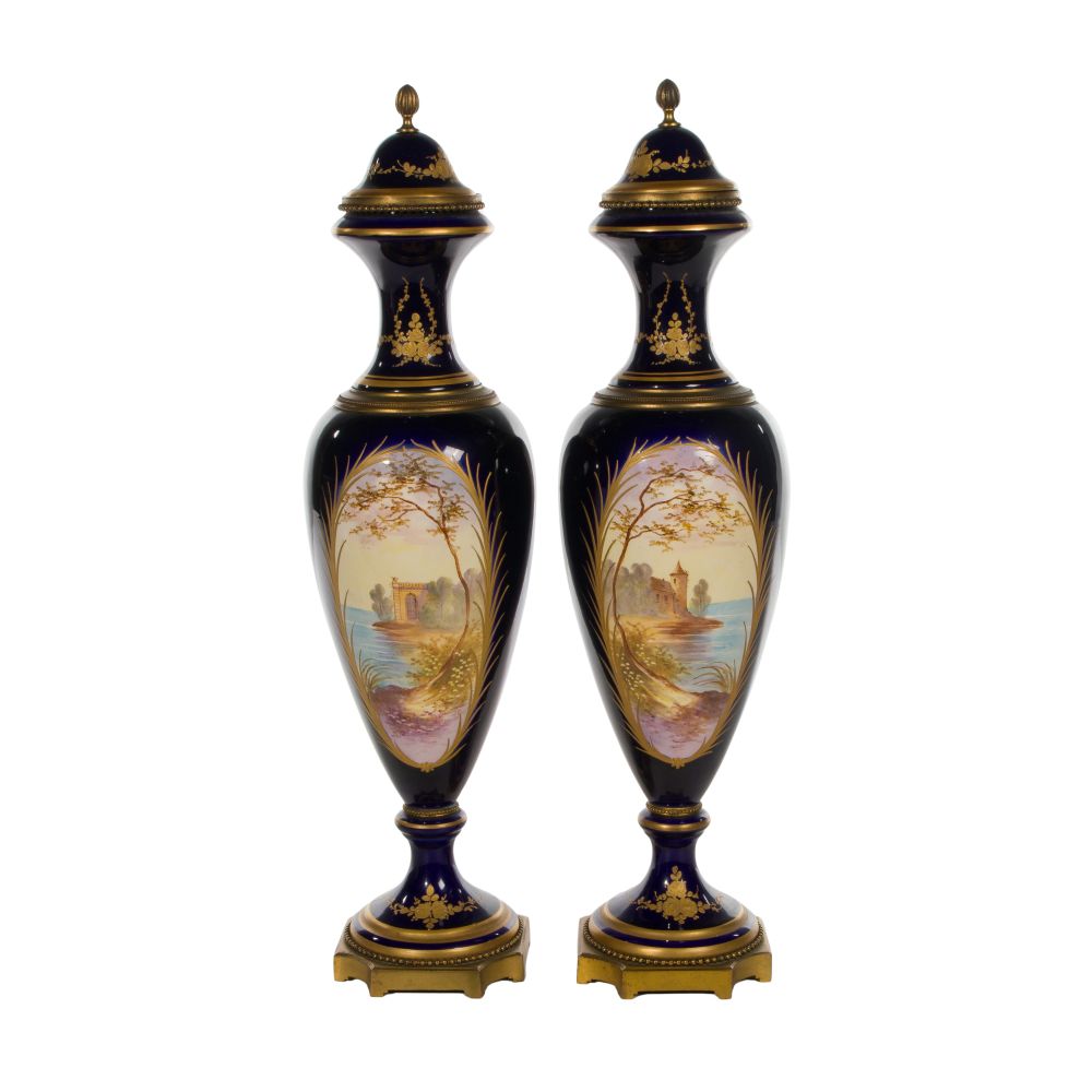 Like pair having hand-painted cartouches on cobalt blue and gilt lidded urns, marked “251” inside lid