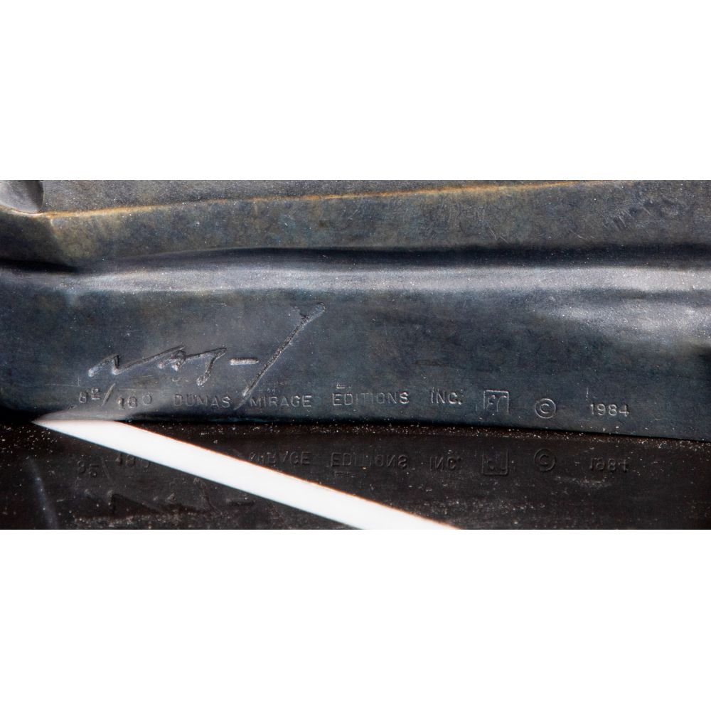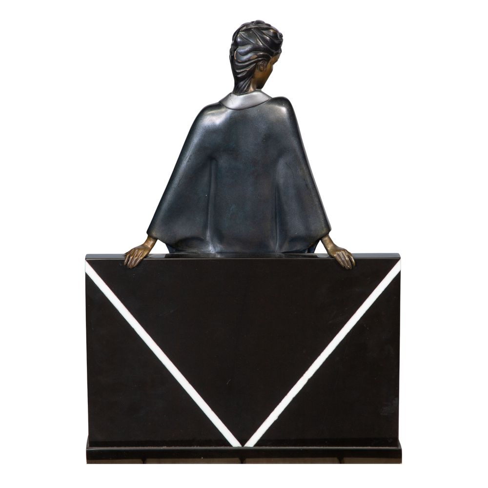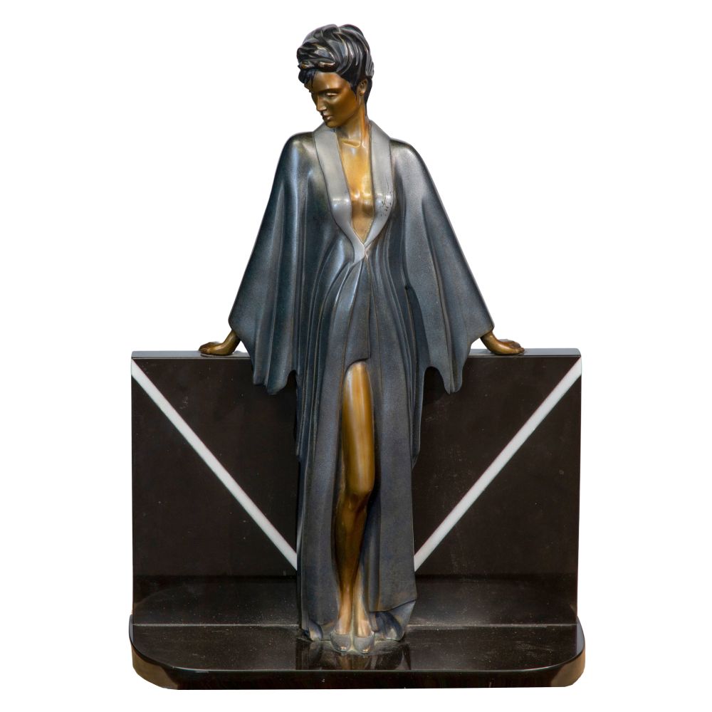 1984, stamp signed, #82/180 and marked “Dumas Mirage Editions Inc.” lower right side, painted bronze and granite, a woman having her face turned in profile, partially open robe, leaning against a black granite ledge having a white marble “V” accent