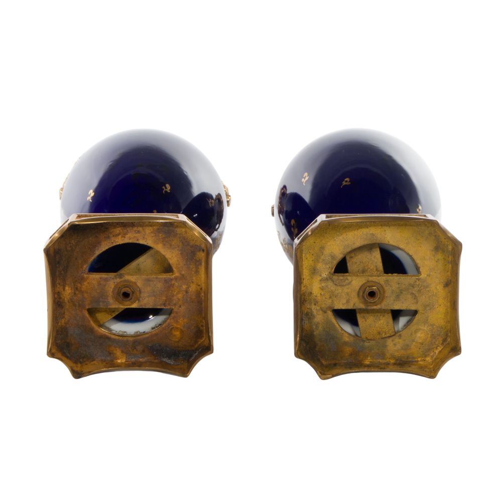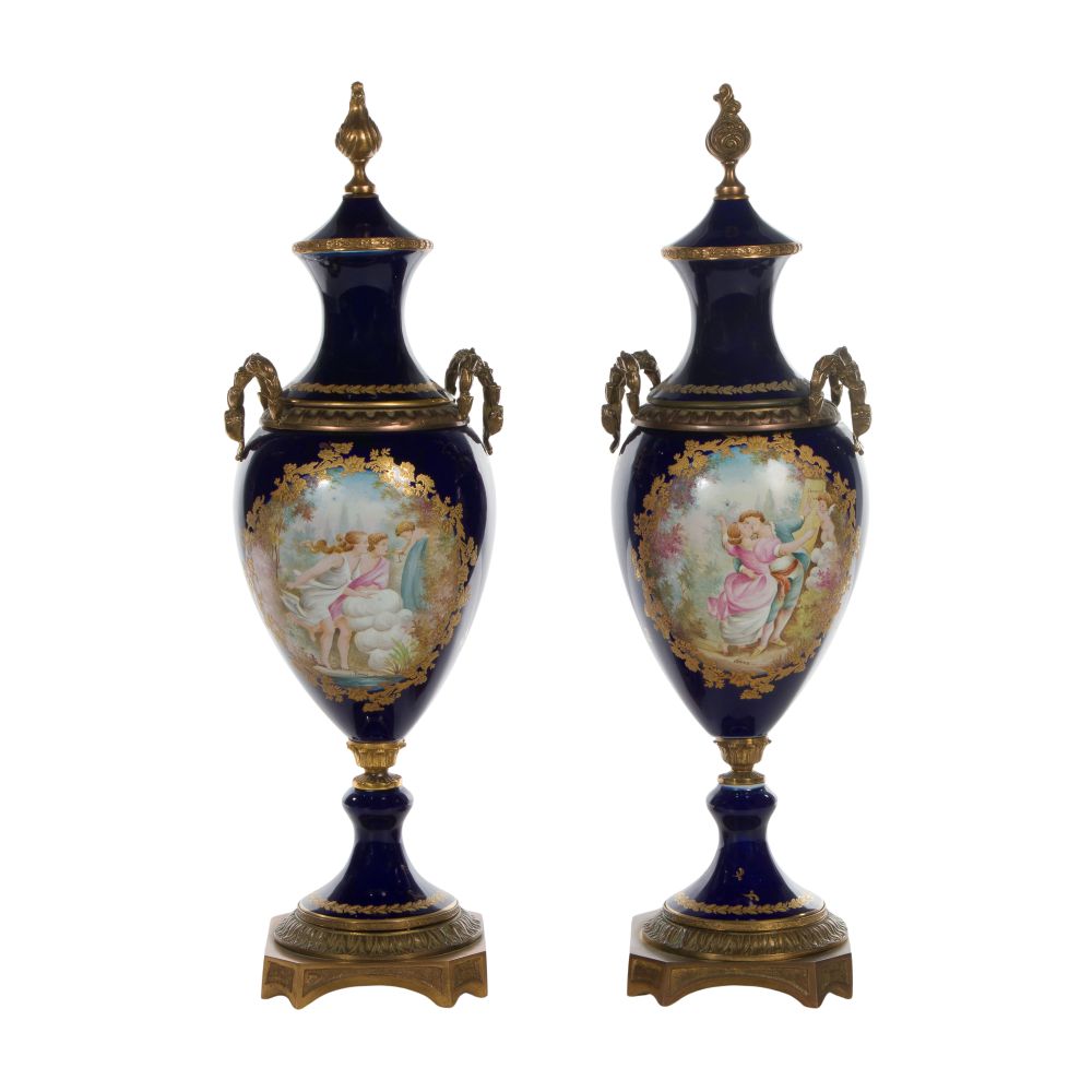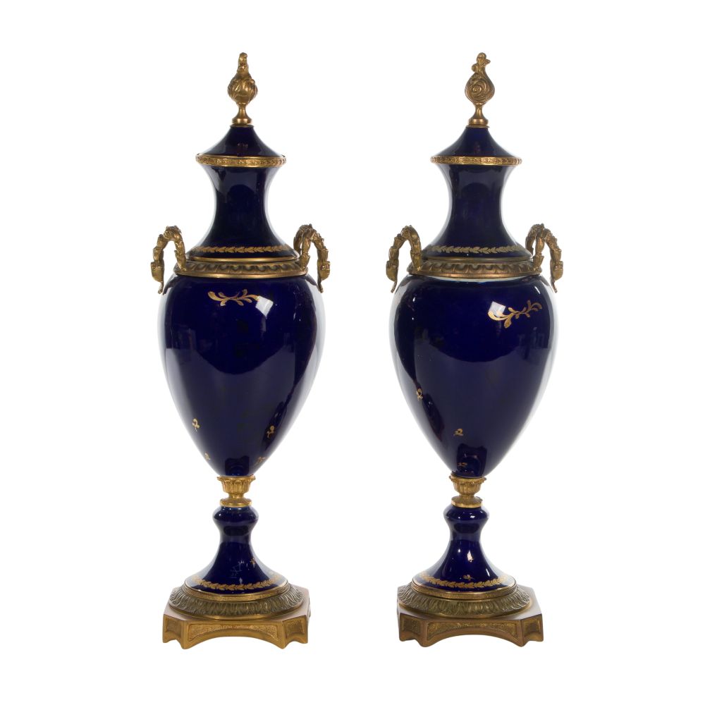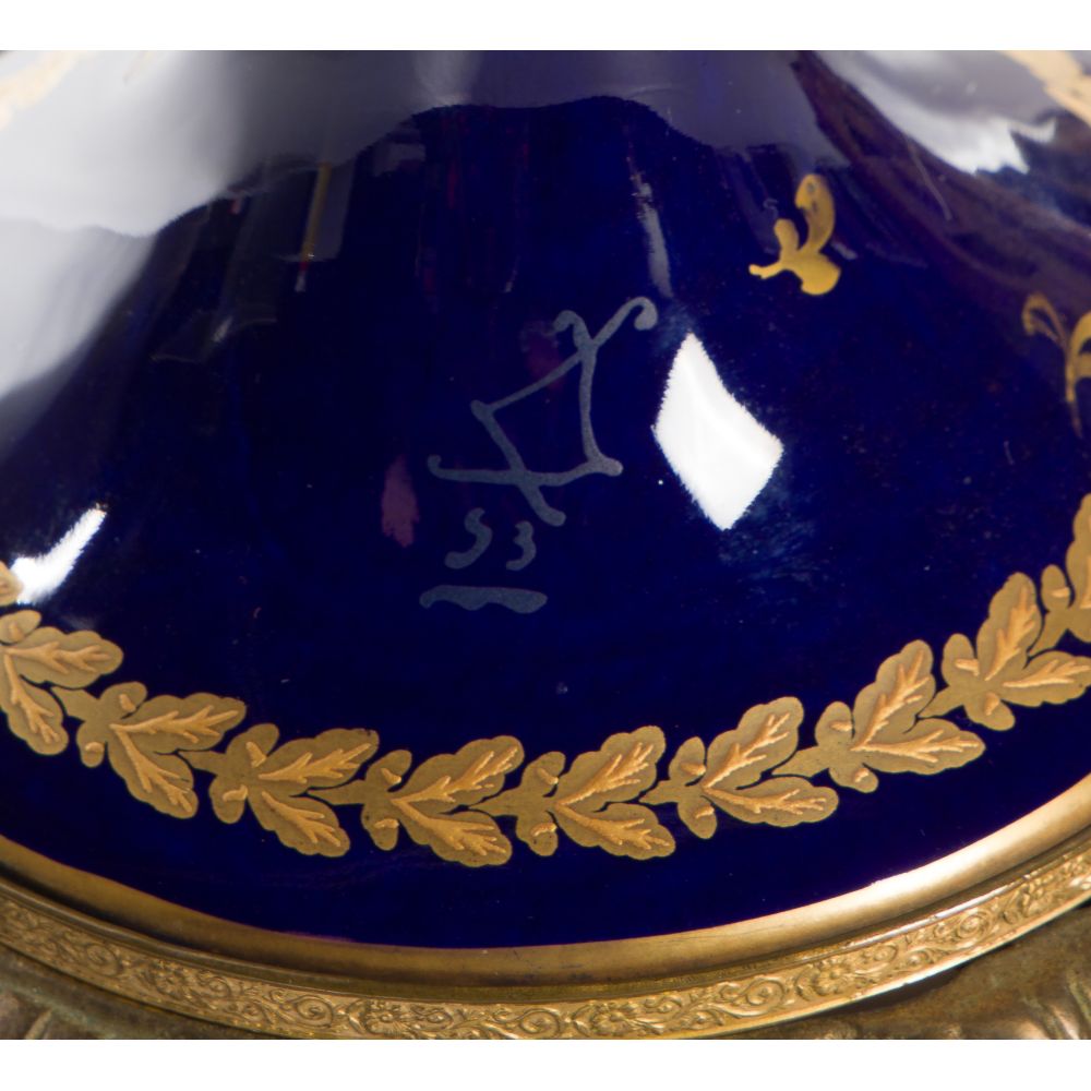 A pair of cobalt lidded urns, having gilt, oval portraits, gilt embellished tops, brass handles and finials, stepped pedestal base, wreathed foot, spurious Sevres marking on foot of base