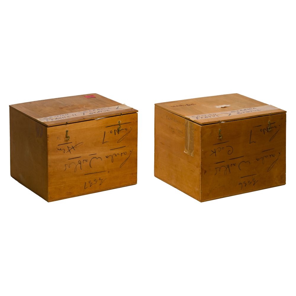 A pair, comprising a cock and hen, marked on bases, each figure retaining its original fitted wood shipping crate