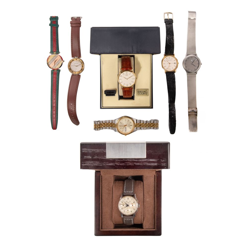 (7) total items including a chronograph watch having a triple dial layout, day date, stopwatch function and leather band, in original box; together with wristwatches including Citizen, Charriot, Bulova, Calving Klein, Seiko having original box