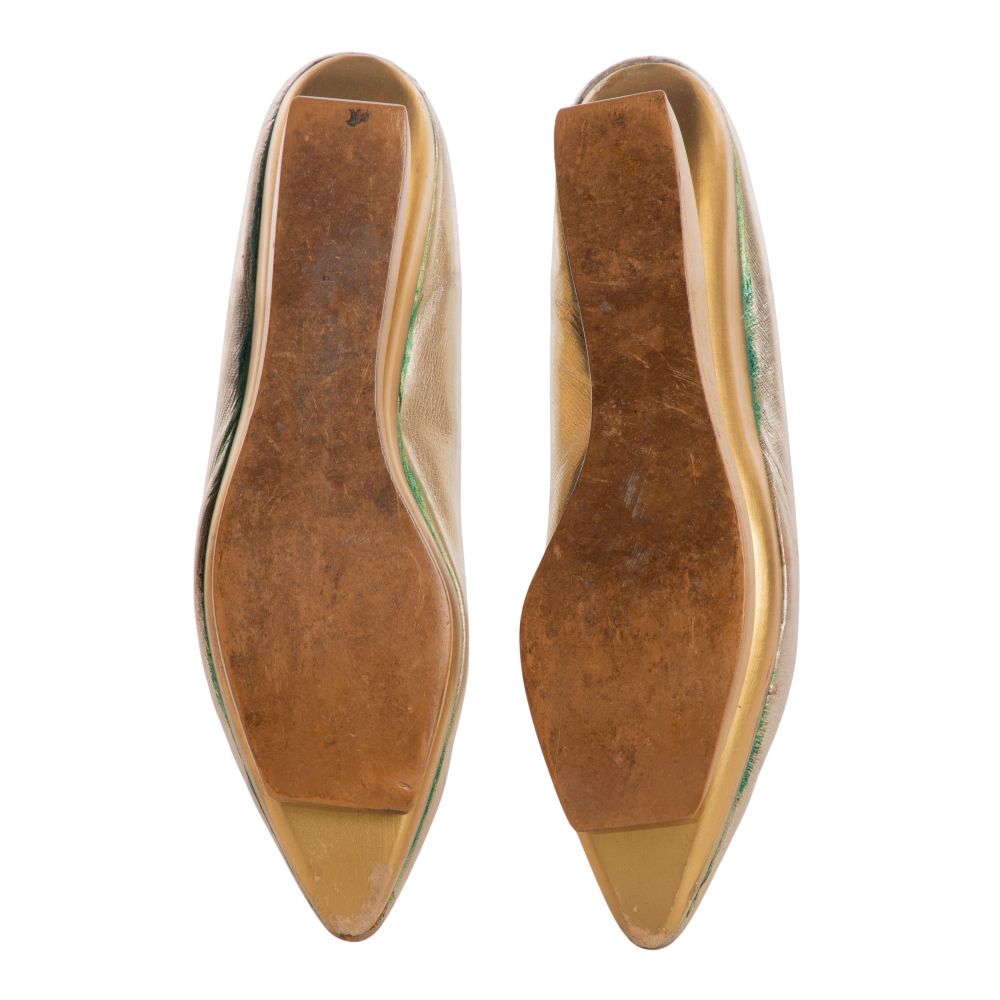 The pair having gold-tone leather uppers on leather soled gold-tone painted wood platforms having cantilevered heels and toes, white leather interiors, gold-tone leather insoles having imprinted white “Kabuki”, the maker mark in a square and patent pending notation, the right shoe having a hand-written ink notation “A 15 8 1/2 N” at upper edge of interior leather, in original box