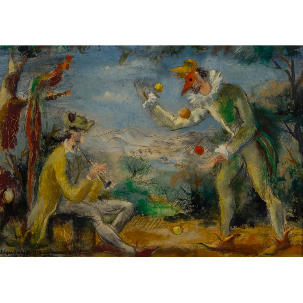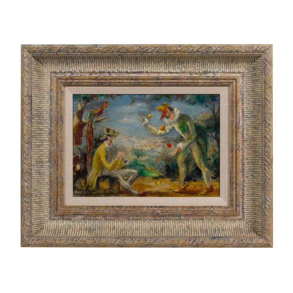 1964, signed lower left, depicting a musician and jester, in a painted wood frame
