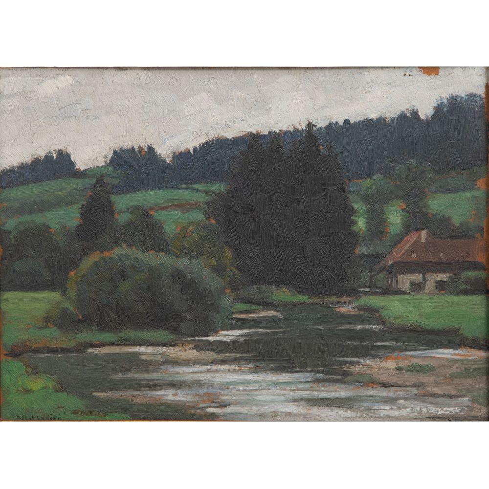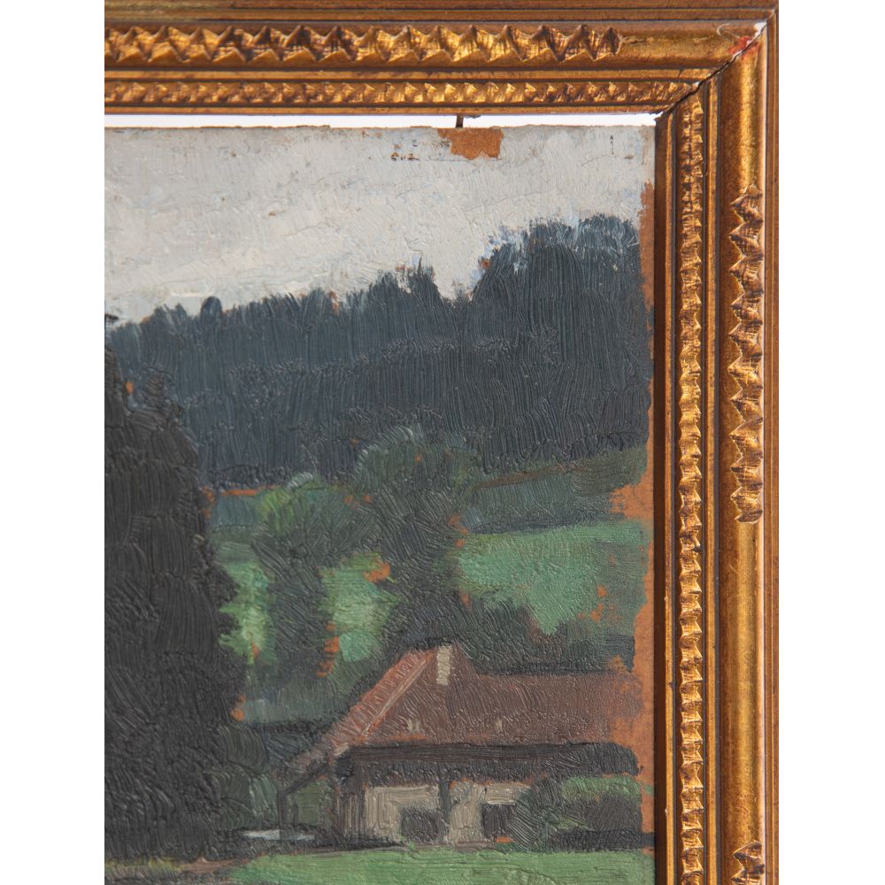 Condition: the river valley having a 0.25-inch loss to paint at right top edge, frames having light wear, the river valley having a 0.25-inch loss to paint at right top edge, frames having light wear