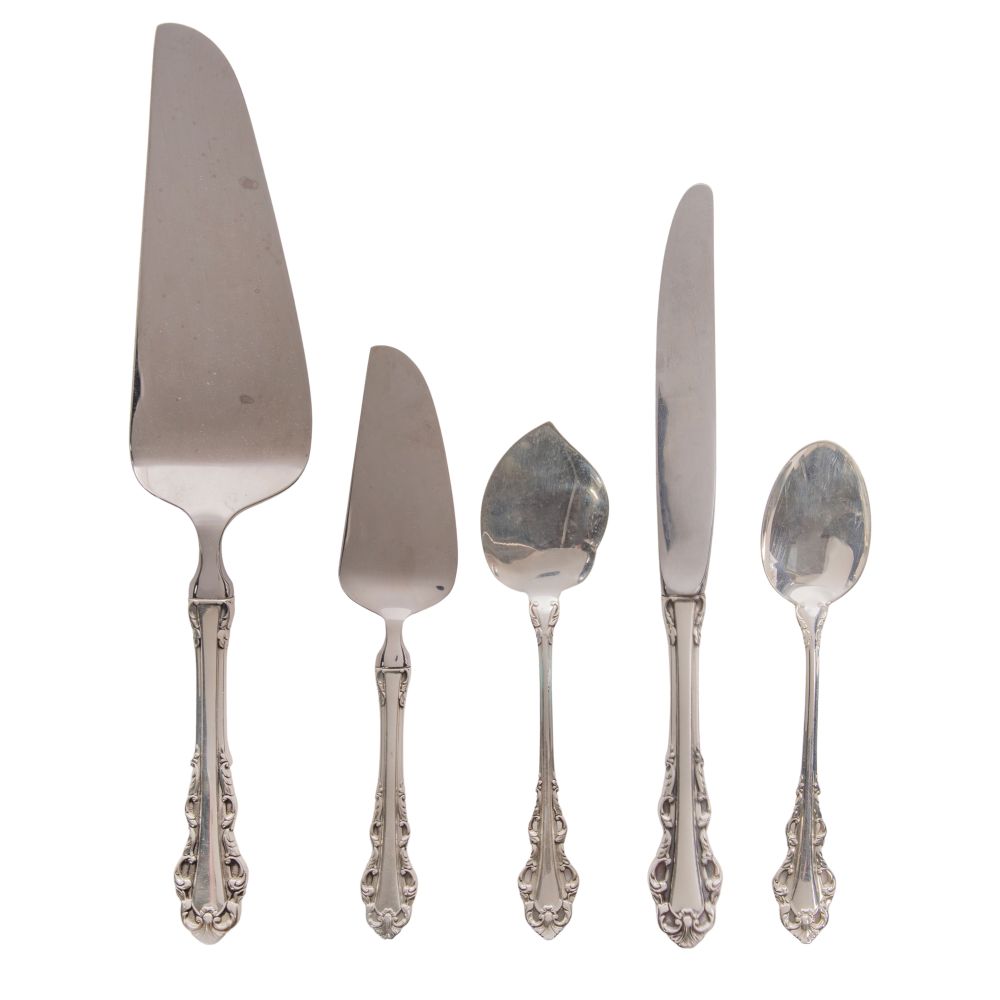 (46) items including Lunt Dresden pattern (12) 9-inch dinner knives, (6) 6-inch teaspoons, (3) serving utensils, various other pieces of table utensils as well as (12) various shape and sized napkin rings (most marked “sterling”)