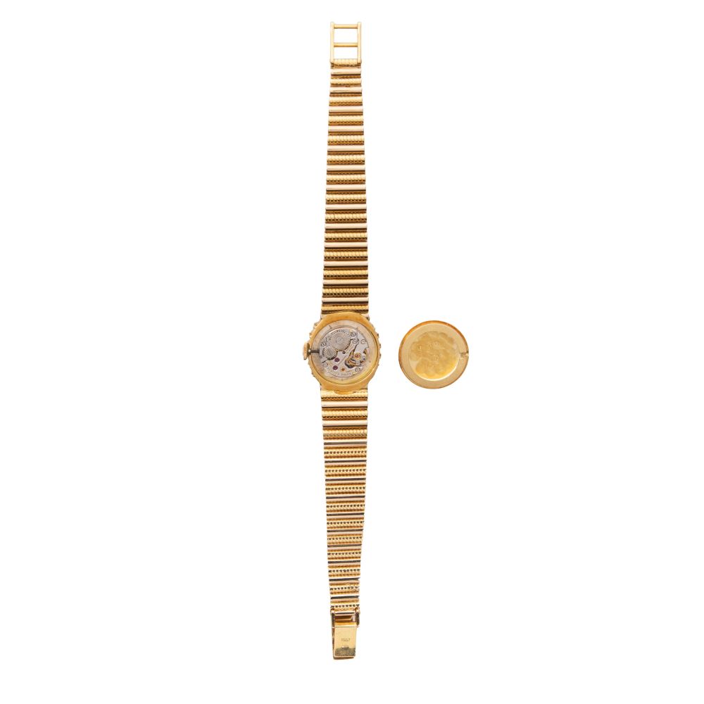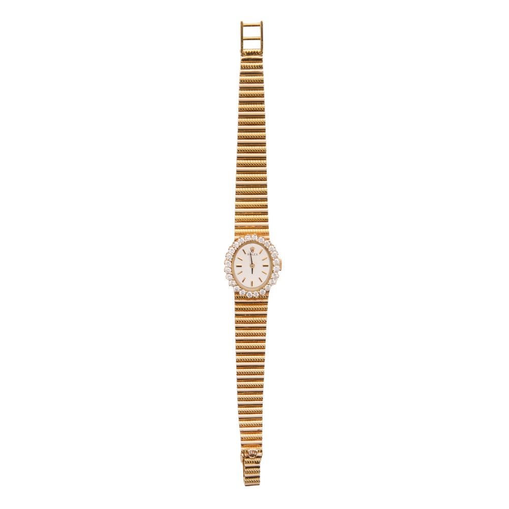 Having a champagne oval dial, gold-tone baton marks, surrounded by twenty-four round cut diamonds, on an integrated bracelet (marked “18k” on back of watch case and band clasp)