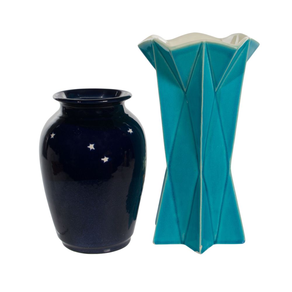 (2) items including a Karen Howell vase having reserve white bunnies on cobalt blue ground signed underside and a Belle Kogan for Red Wing Pottery Prismatique Vase #797 in light blue, raised Red Wing mark underside