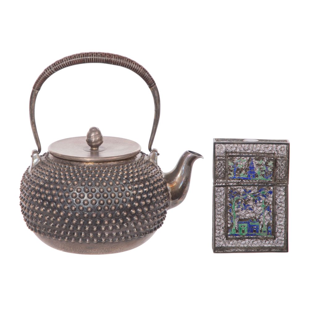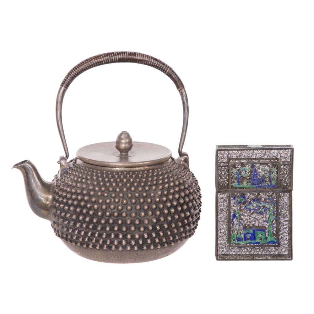 (2) total items including a hobnail pattern Tetsubin teapot (marked having a fine silver Japanese hallmark); together with a silver and enamel filigree card case (unmarked silver)