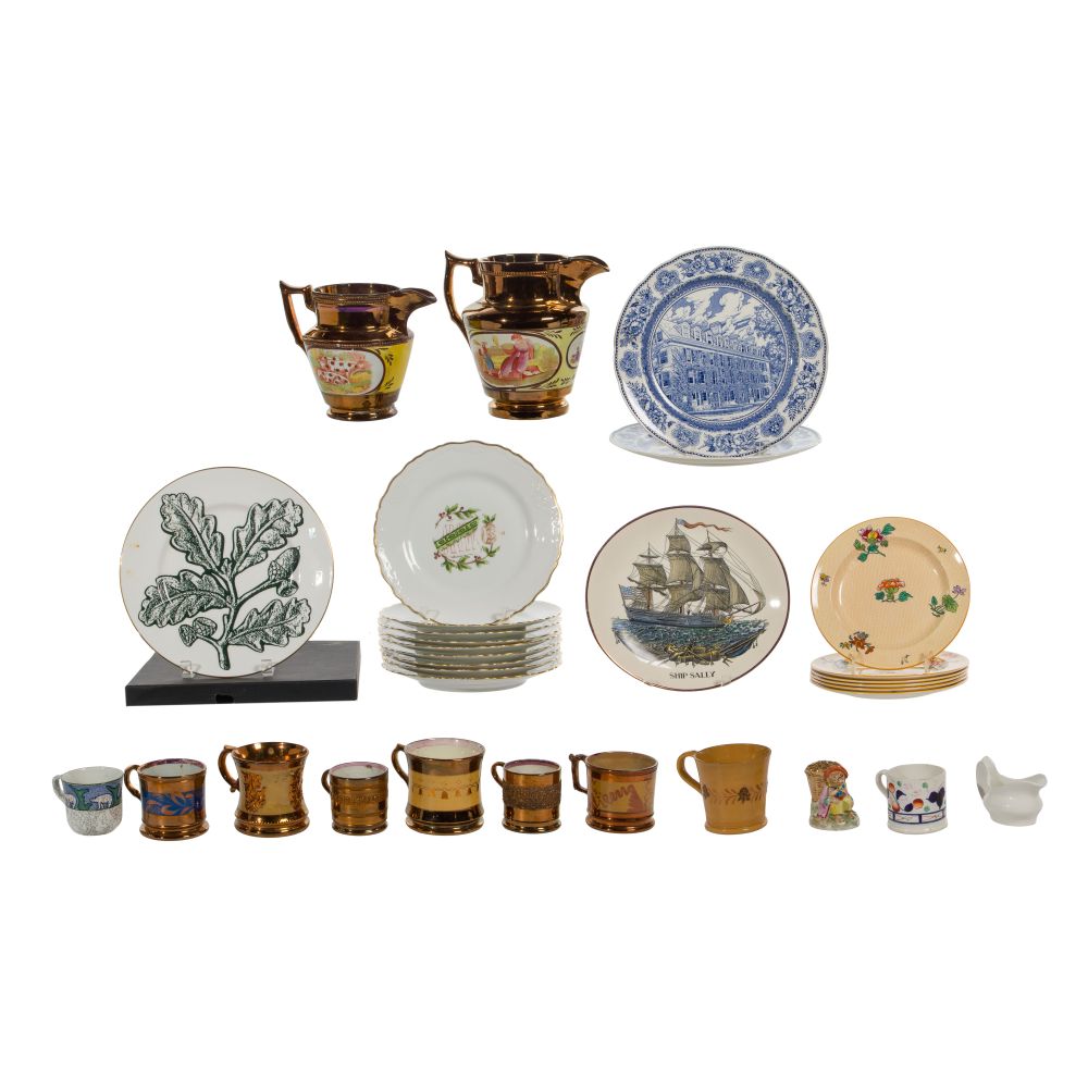 (32) items including (9) armorial plates marked “Saxe”, (6) Wedgwood Etruria plates, a 2007 commemorative Prince of Wales plate having box, (3) wall plates, (2) pitchers and (7) mugs in copper lusterware as well as a demitasse cup, a shaving cup, a creamer and a figurine