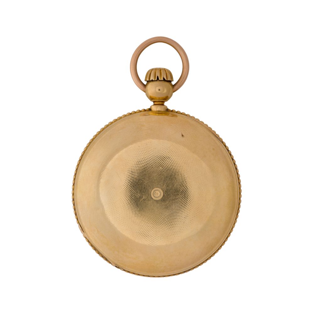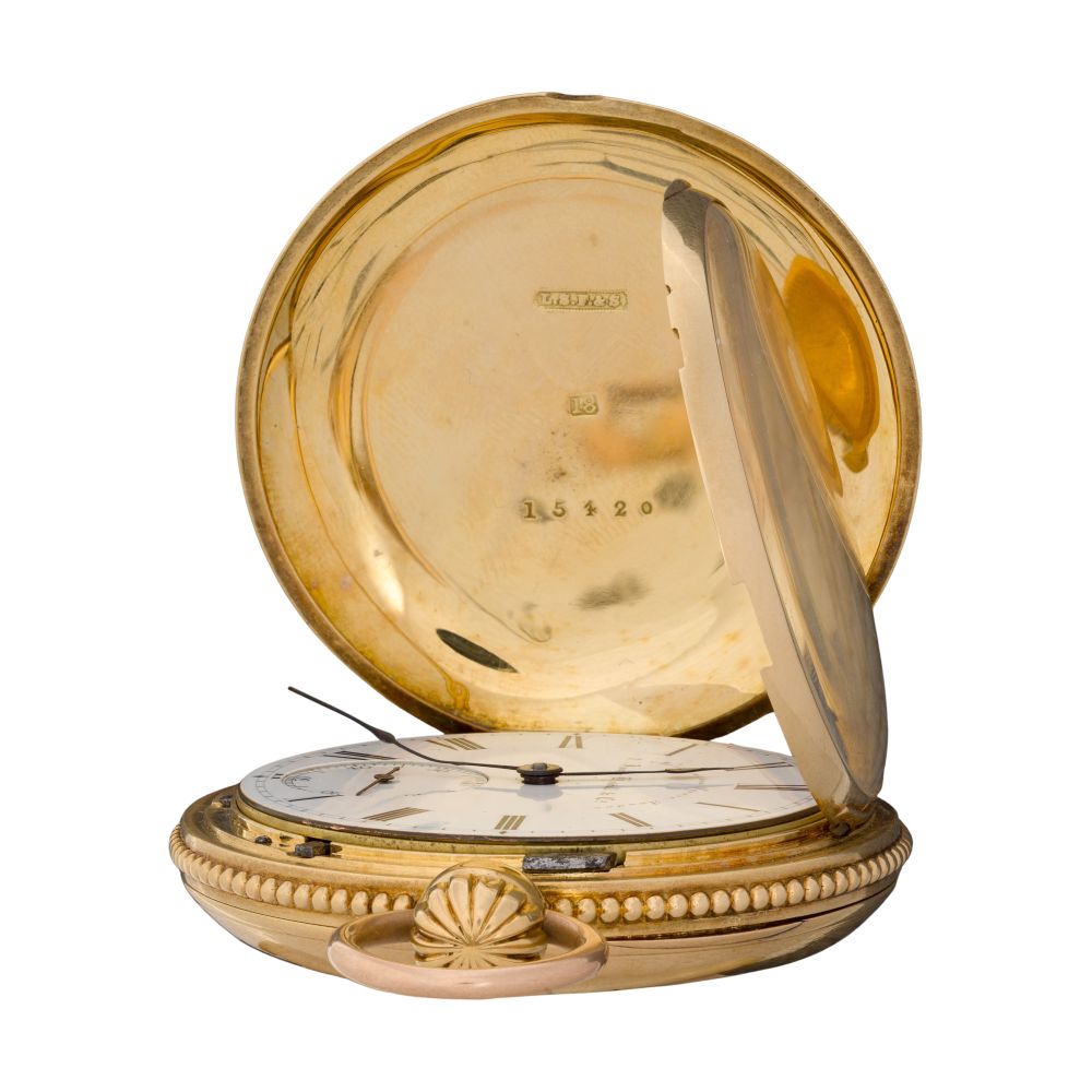 Serial #15420 dating to c.1870, white dial having Roman numerals, blue hands, subsidiary dial for seconds, key wind, key set (marked “18” inside front and back of case)
