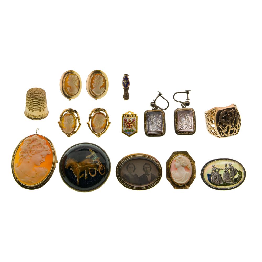 (12) items including a signet “B” ring (marked “14k”), a pair of earrings (marked “835”) as well as pins, earrings and a thimble in a Marshall Field’s box