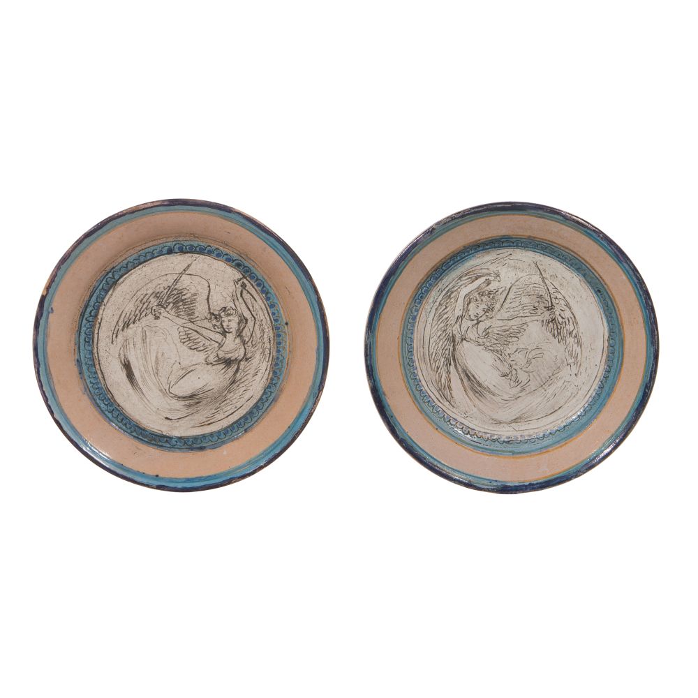 (2) items having incised angels holding swords, pink and blue bands around interior edges, incised signature and stamp verso