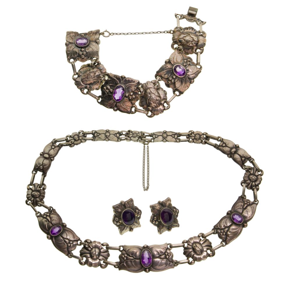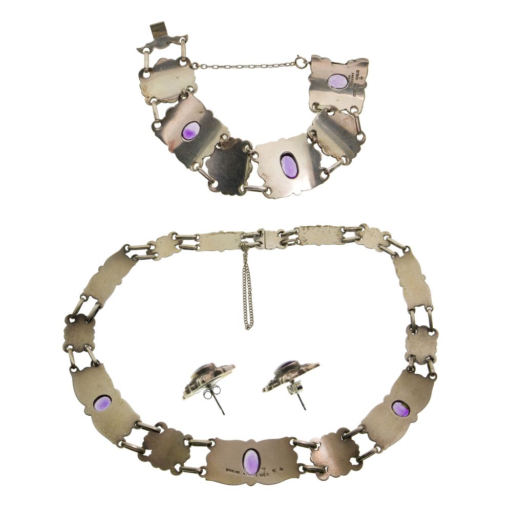A (3)-piece suite #54 including a choker style necklace, a bracelet and pair of earrings, each having oval cut amethyst accents in a grape motif (stamped “Kalo” and “sterling silver”)