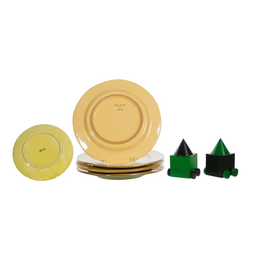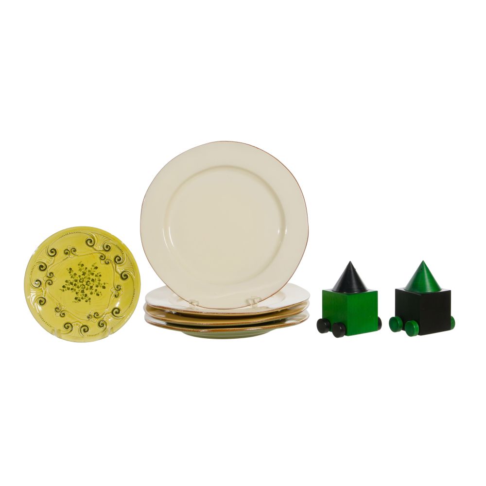 (7) total items including a set of (4) plates (two cream, two light yellow) stamped “Vietri” on underside and a hand painted yellow plate having illegible stamp on underside; together with a pair of salt and pepper shakers stamped “Legnomangia” on underside