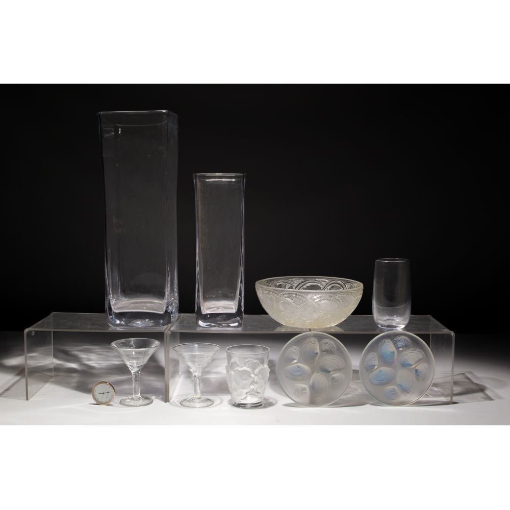 (9) items including a Lalique Pinson bowl and Chene Oak double old fashioned, both etch marked, (3) Simon Pearce vases, a clock, (2) Sabino clam shell opalescent plates and a pair of martini glasses