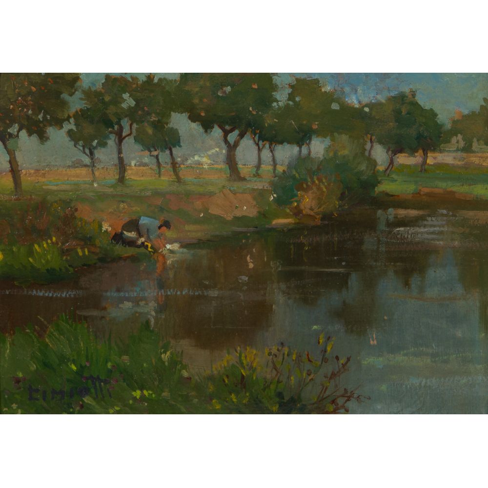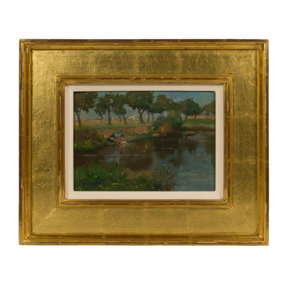 (2) undated, signed items including “The Village” and “Woman Washing Clothes” depicting a figure washing clothes in a stream, in matching gilt wood frame