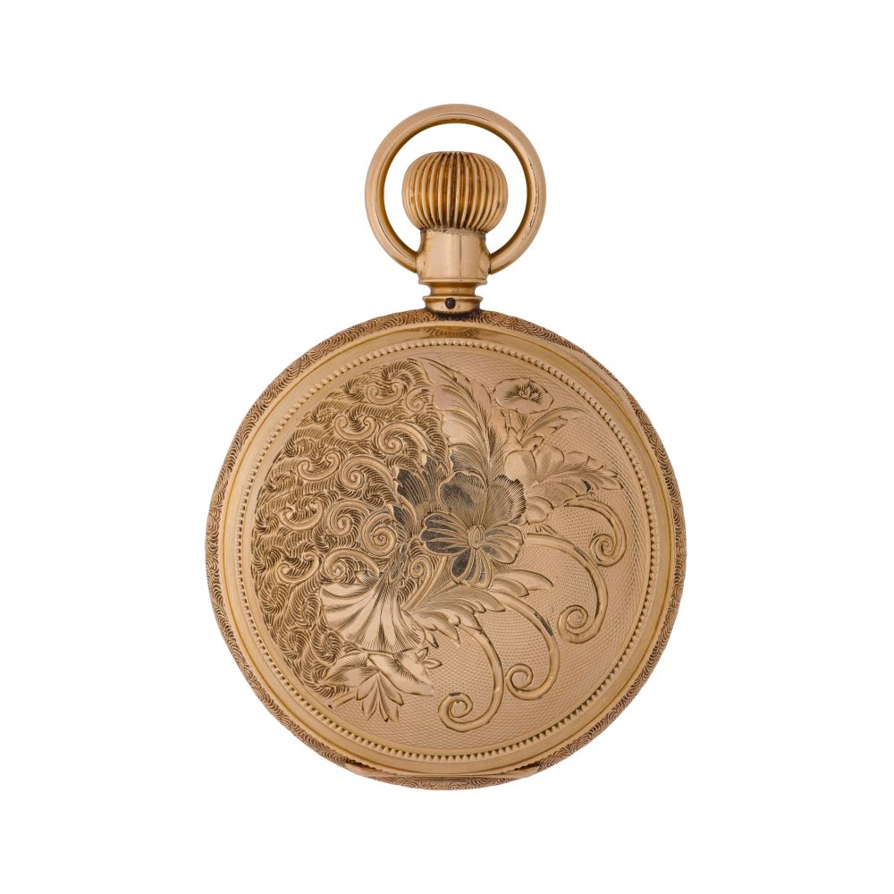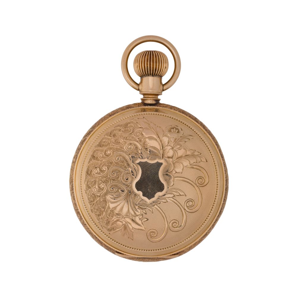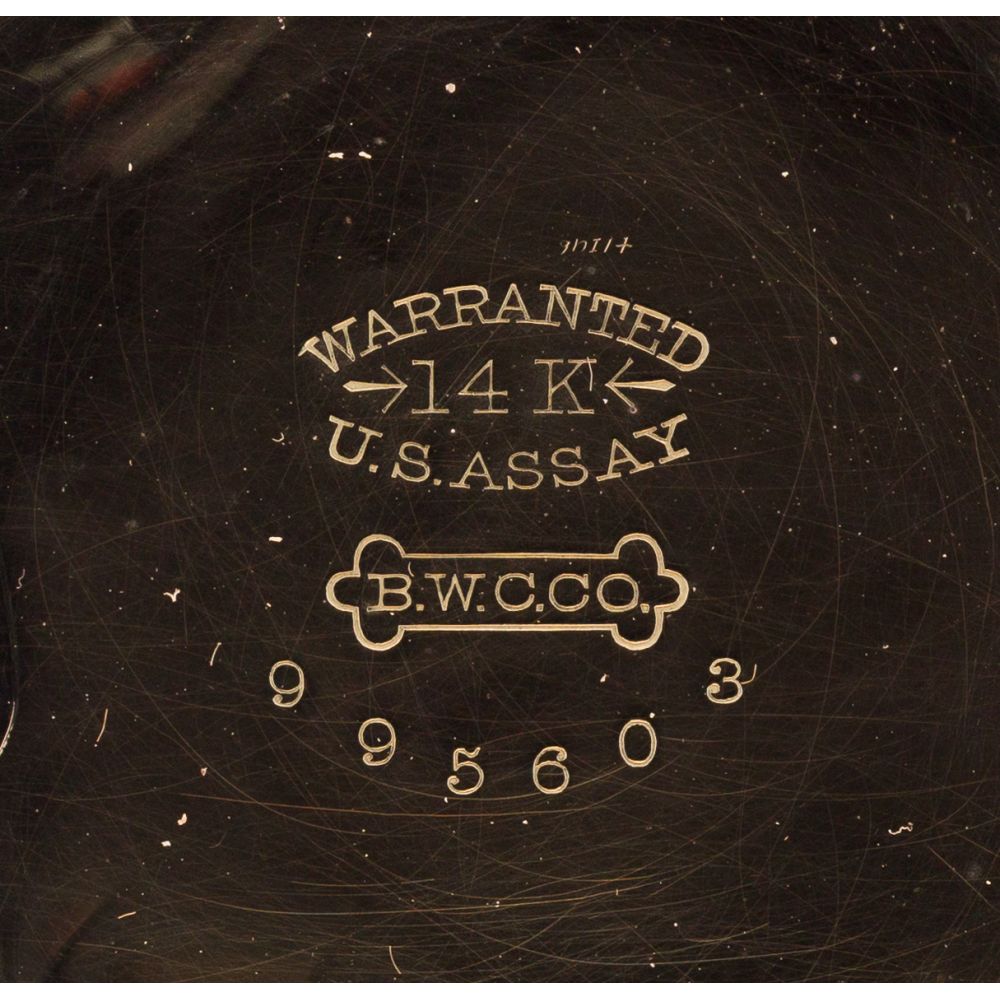 Serial #18798974 dating to c.1916, 15-jewel movement, 316 grade, white dial having Roman numerals, gold-tone hands, subsidiary dial for seconds, stem wind, lever set (marked “Warranted 14k U.S. Assay” inside case)
