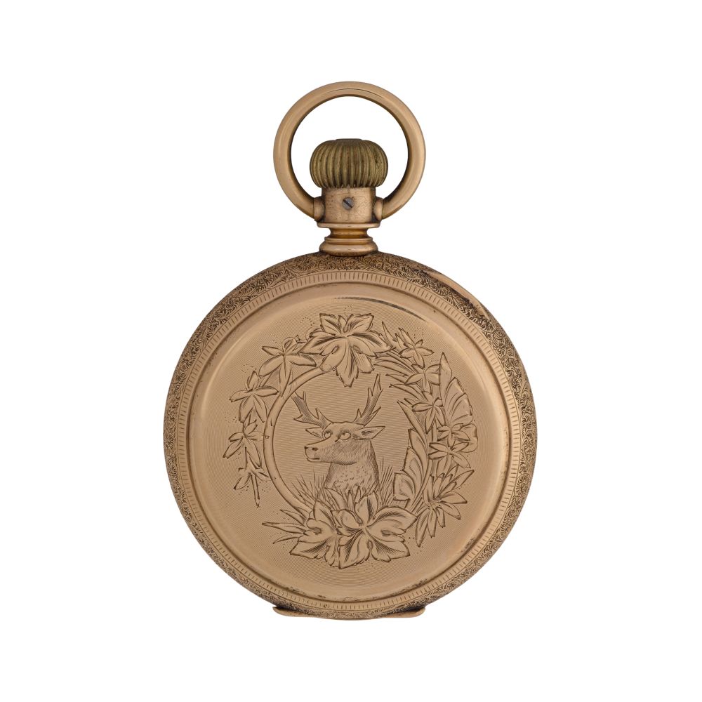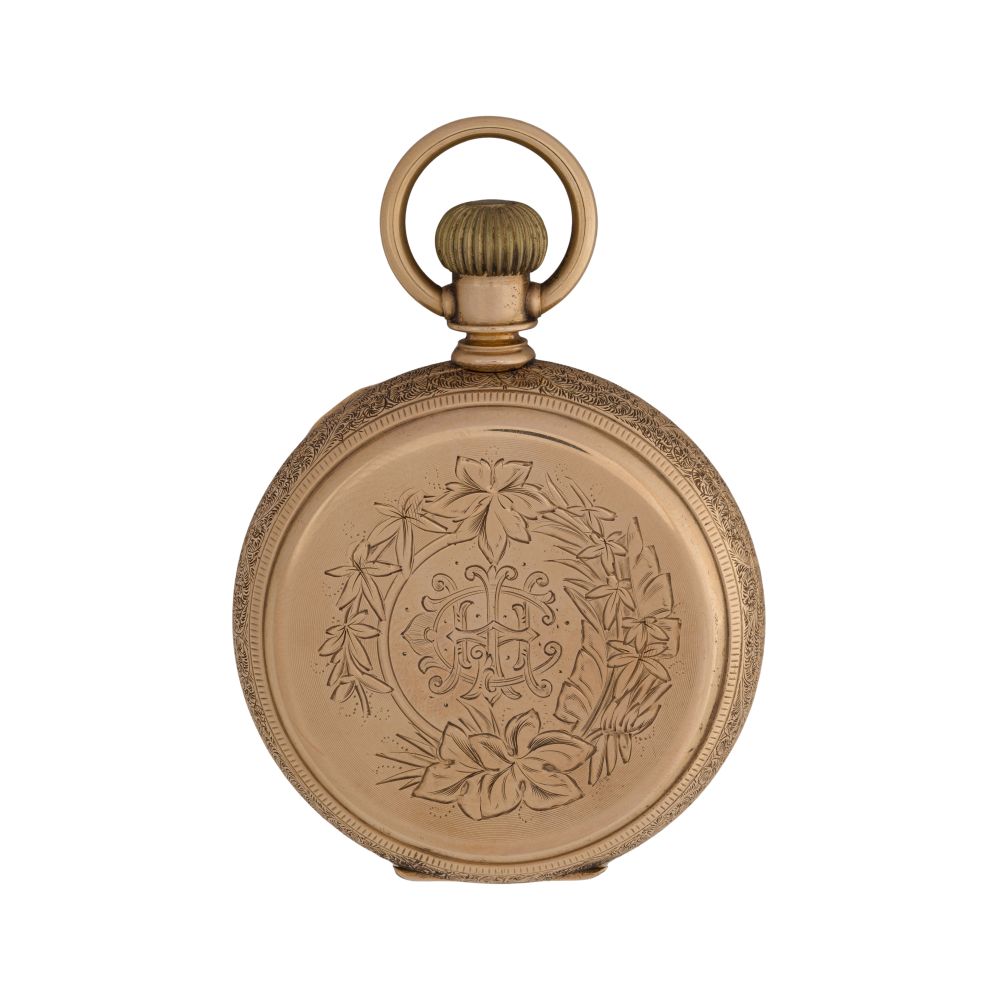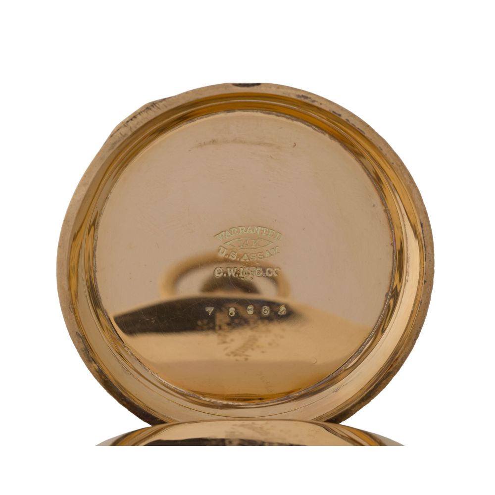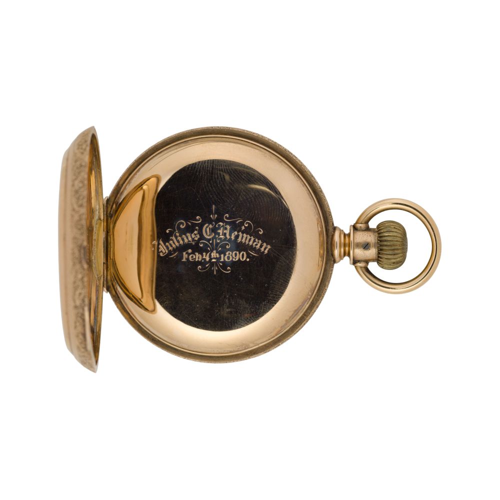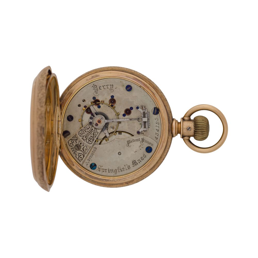 Serial #434125 dating to c.1886, 15-jewel movement, J.C. Perry grade, white dial having Roman numerals, blue hands, subsidiary dial for seconds, stem wind, lever set (marked “Warranted 14k U.S. Assay” inside case)