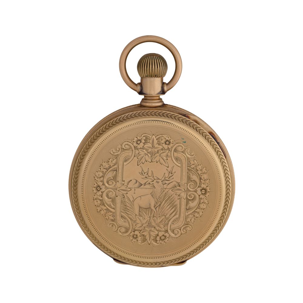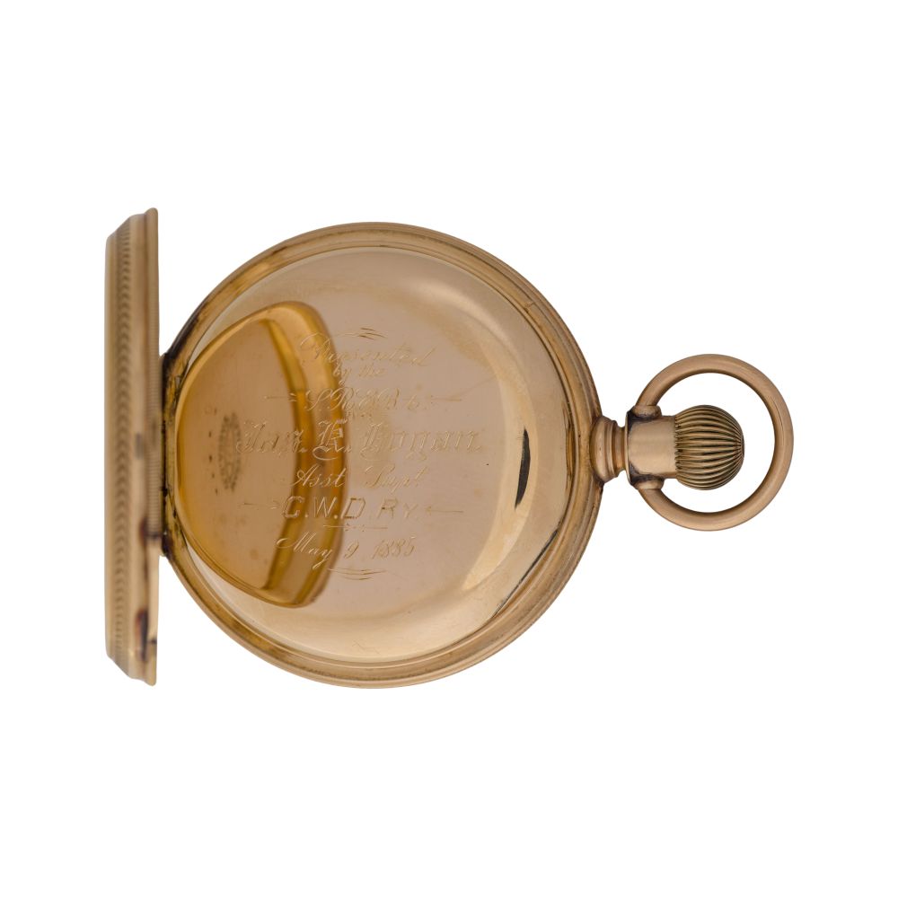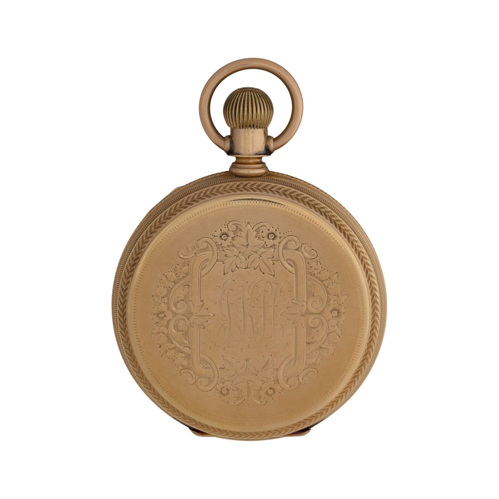 Serial #201903 dating to c.1884, 15-jewel movement, No.4 grade, white dial, Roman numerals, blue hands, subsidiary dial for seconds, stem wind, stem set (marked “Warranted 14k U.S. Assay” inside case)