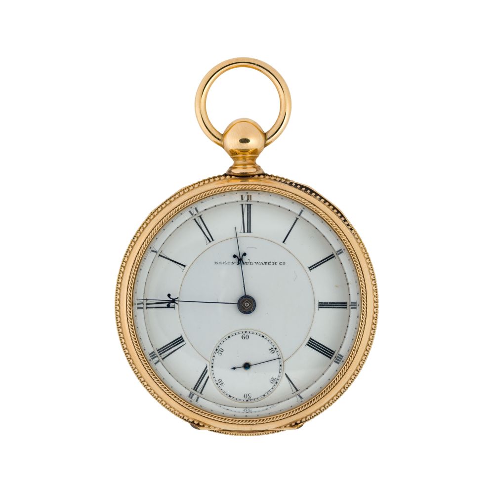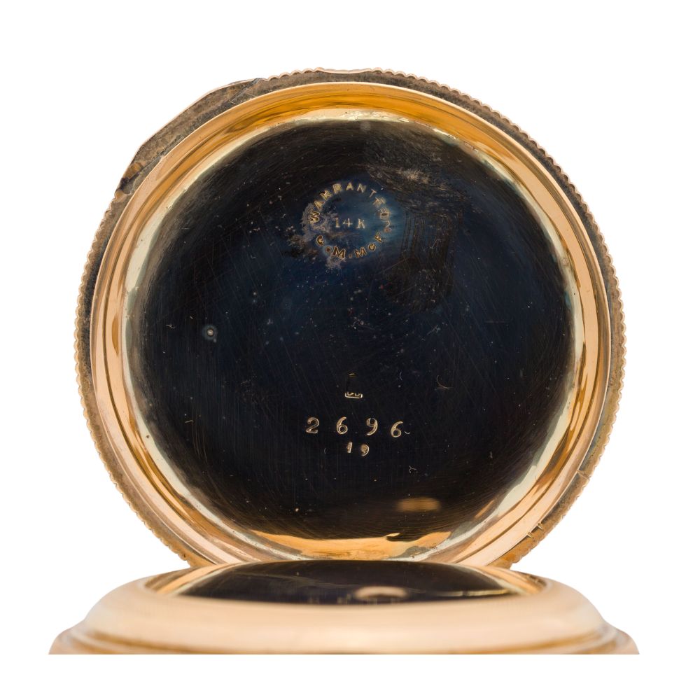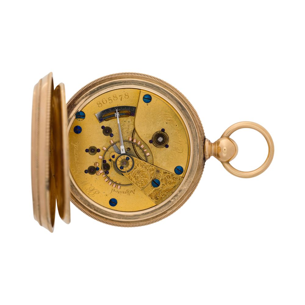 Serial #865878 dating to c.1881, 15-jewel movement, No.69 grade, white dial having Roman numerals, blue hands, subsidiary dial for seconds, key wind, key set (marked “Warranted 14k” inside case and inside dust cover)