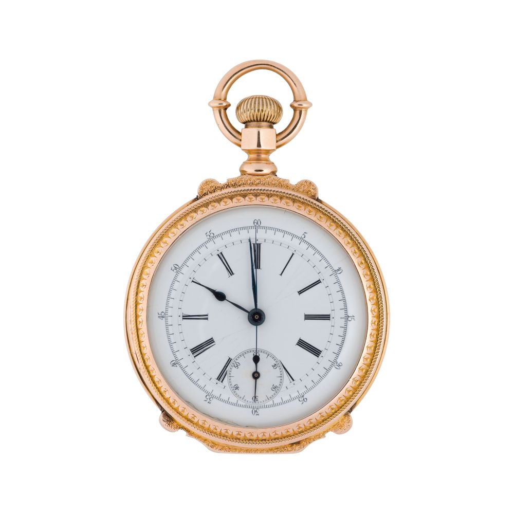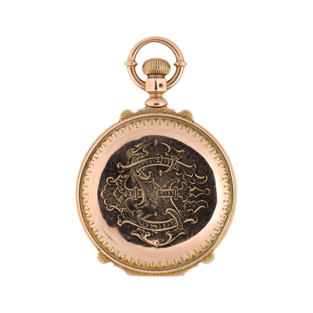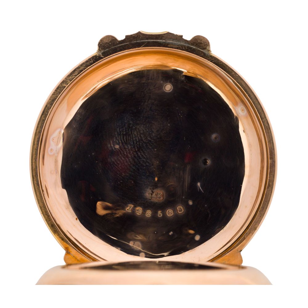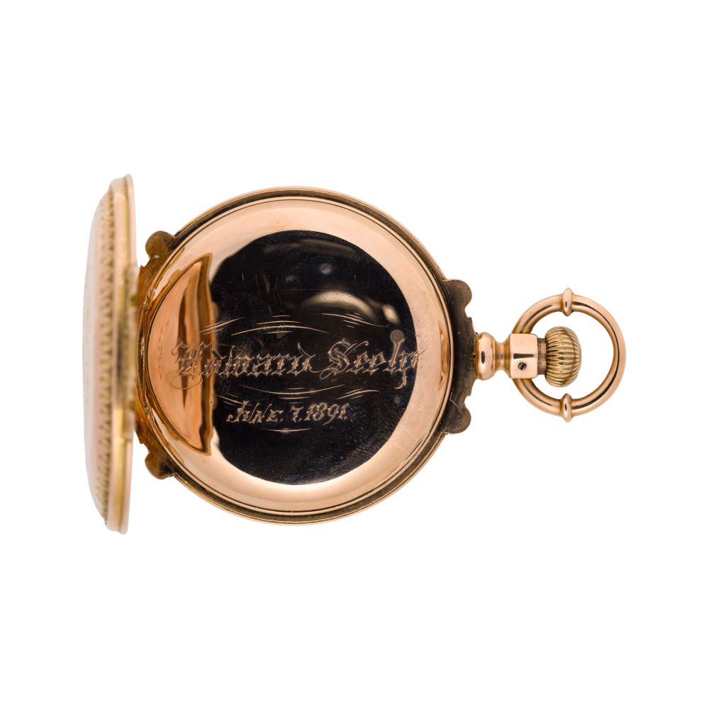 Serial #198563 on case dating to c.1885, white dial having Roman numerals, blue hands, subsidiary dial for seconds, stem wind (marked “14k” inside case)