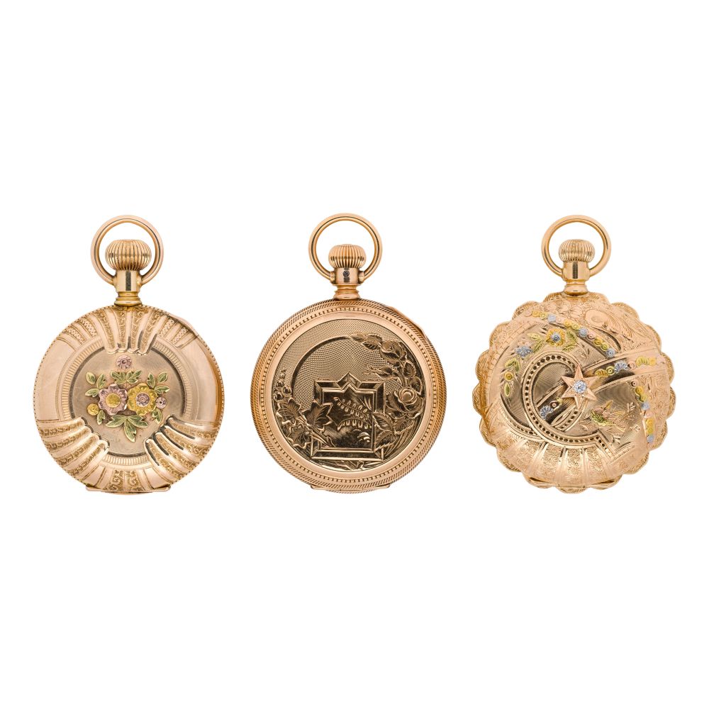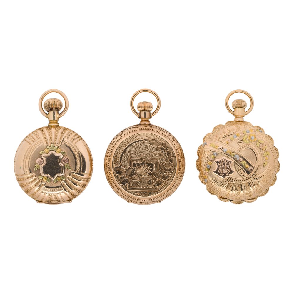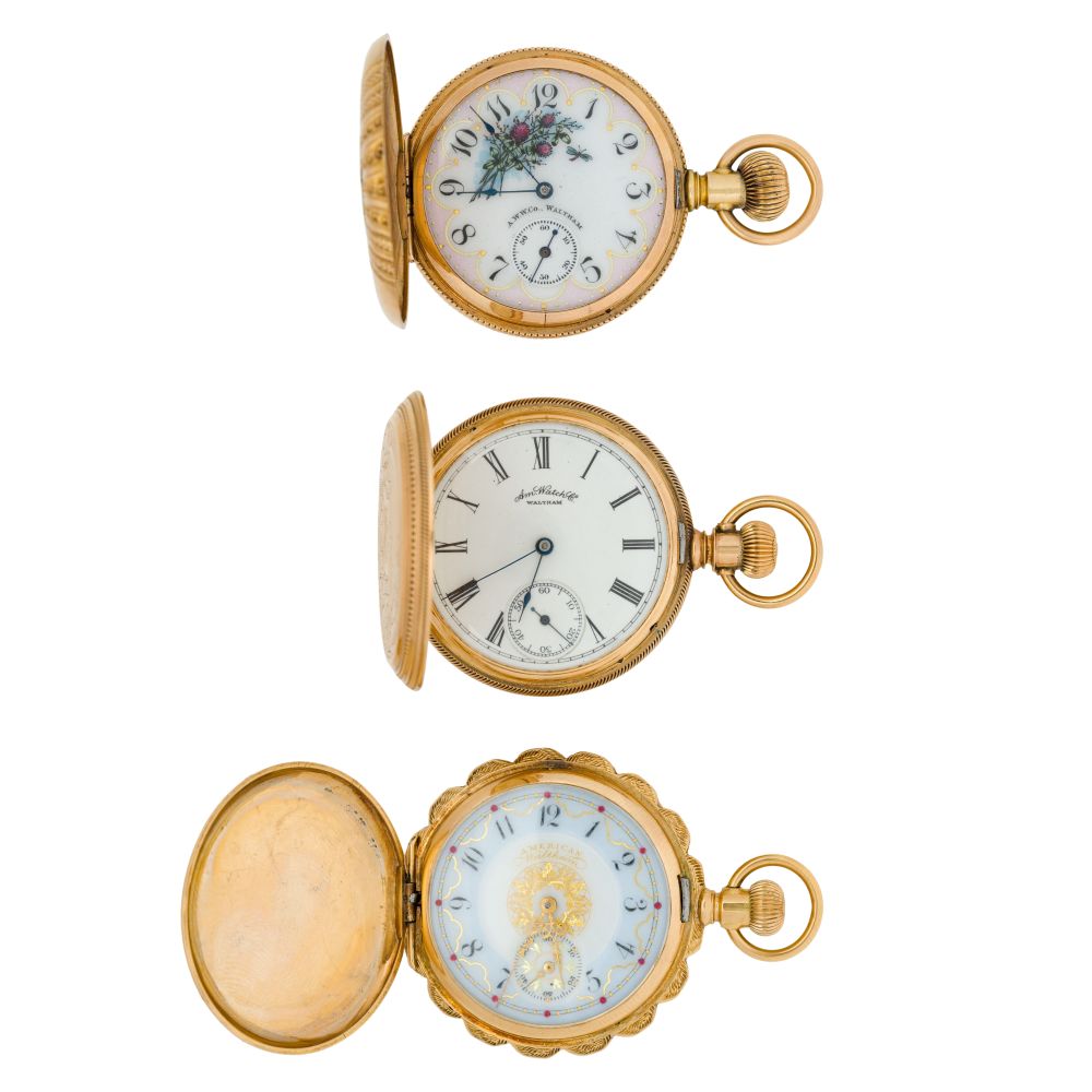 (3) items including serial #5505973 dating to c.1892, 11-jewel movement, H grade, pendant set (marked “C.M.MFG.Co. 14k U.S. Assay” inside case), serial #337243 dating to c.1887, 7-jewel movement, E grade, lever set (marked “14k” inside case and dust cover) and serial #16187277 dating to c.1907, 16-jewel movement, Lady Waltham grade, pendant set (marked “14k” inside case)