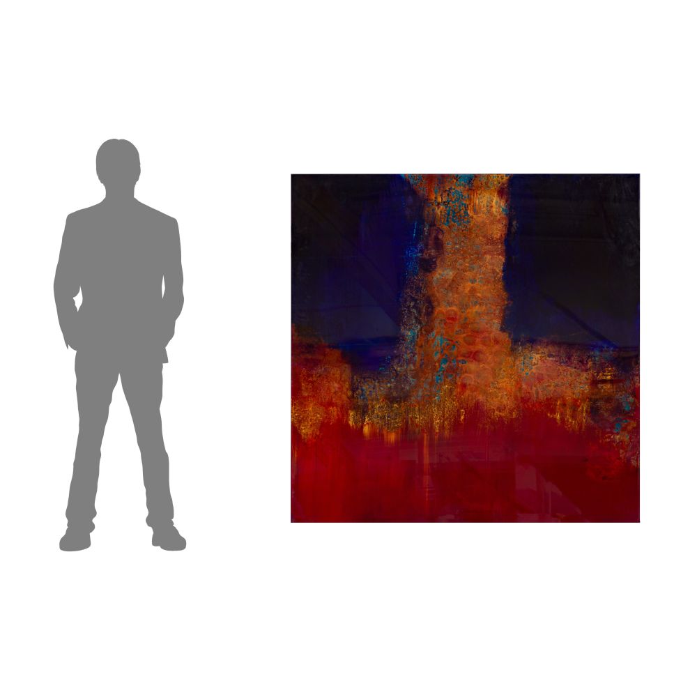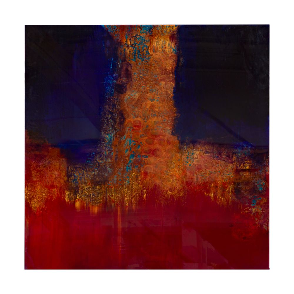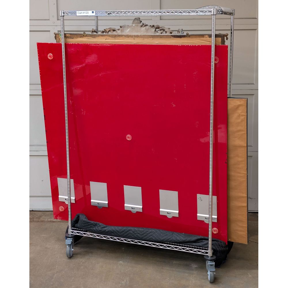 Undated and unsigned abstract composition on undetermined rigid substrate having self-leveling clear resin top coat, red resin verso having attached hanging plates and wall-protecting rubber spacers, unframed