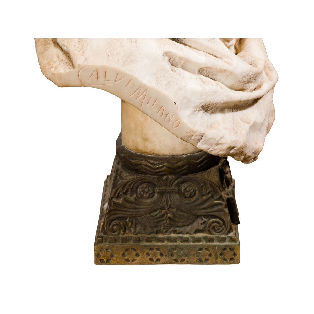 Carved “CALVI MILANO” at left shoulder, cast bronze face attached to carved marble on a bronze base