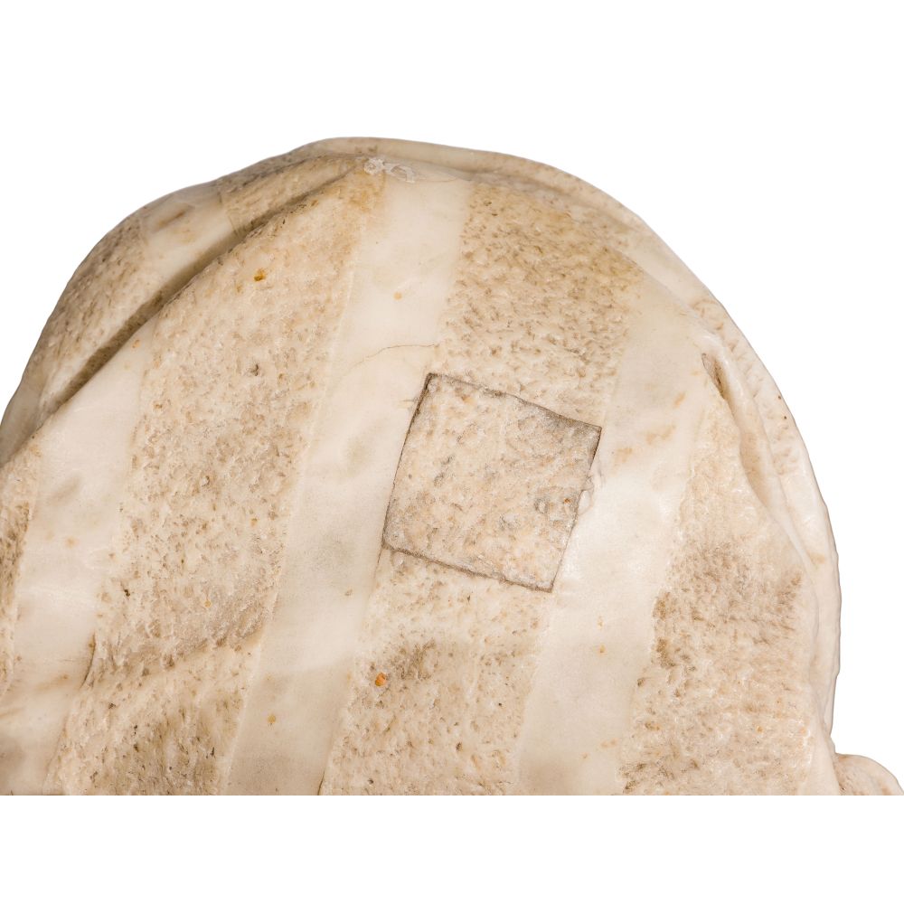 Condition: light wear, marble assembled from fitted pieces, a gap developing at joint, a square patch at back of head covering attachment bolt for bronze face as part of process, light wear, marble assembled from fitted pieces, a gap developing at joint, a square patch at back of head covering attachment bolt for bronze face as part of process