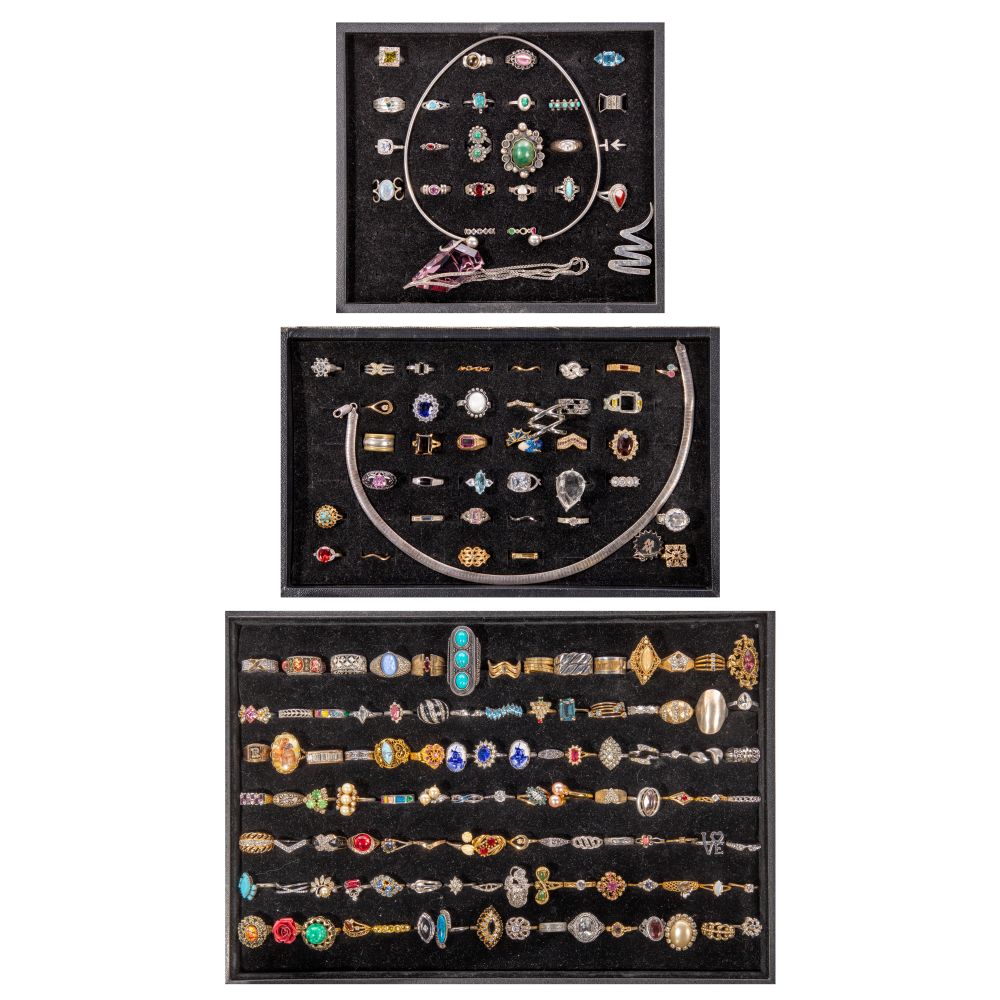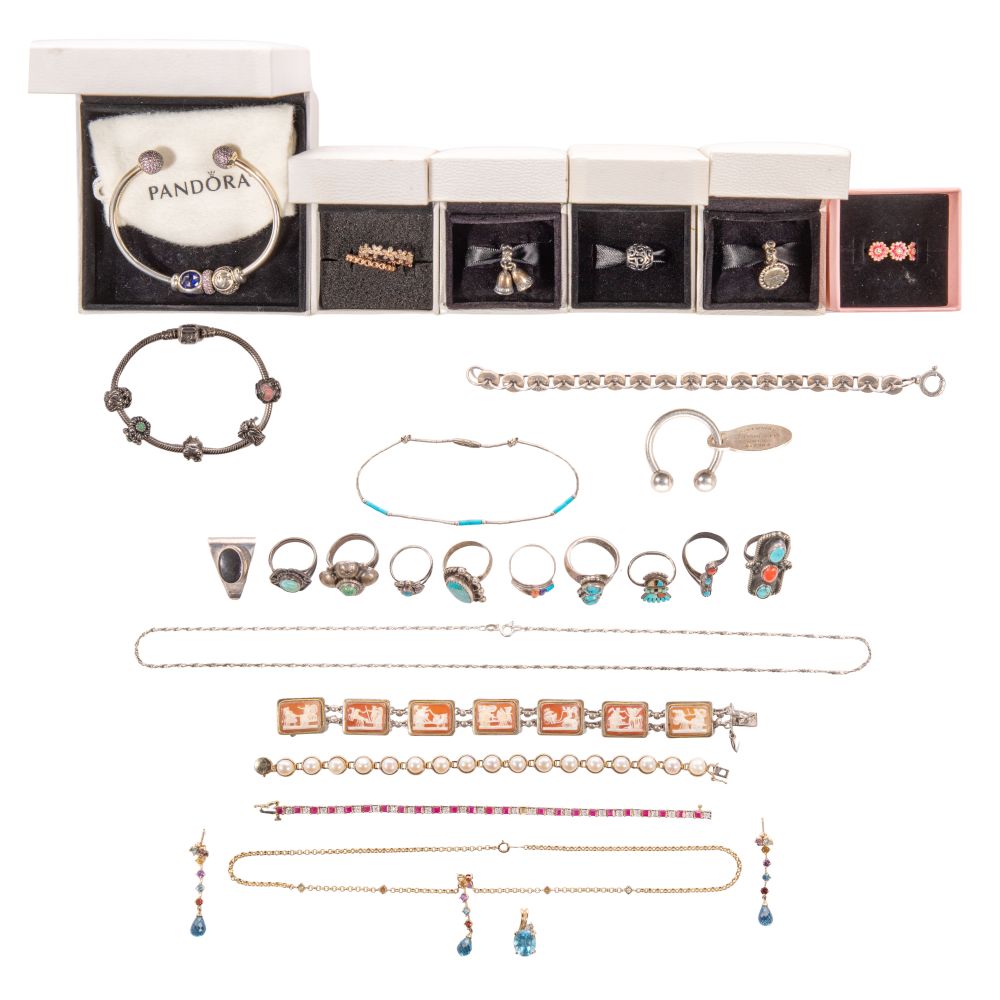 Including (2) bracelets, a necklace having a matching set of earrings and a pendant (all marked “10k”), a round link bracelet and key ring (marked Tiffany “925”), (2) bracelets having attached charms, (4) boxed charms, (3) rings having two boxes (marked ALE, Pandora, “925”), rings, necklaces, pendants, earrings (marked “925”) as well as numerous fashion rings in various shapes, sizes and designs