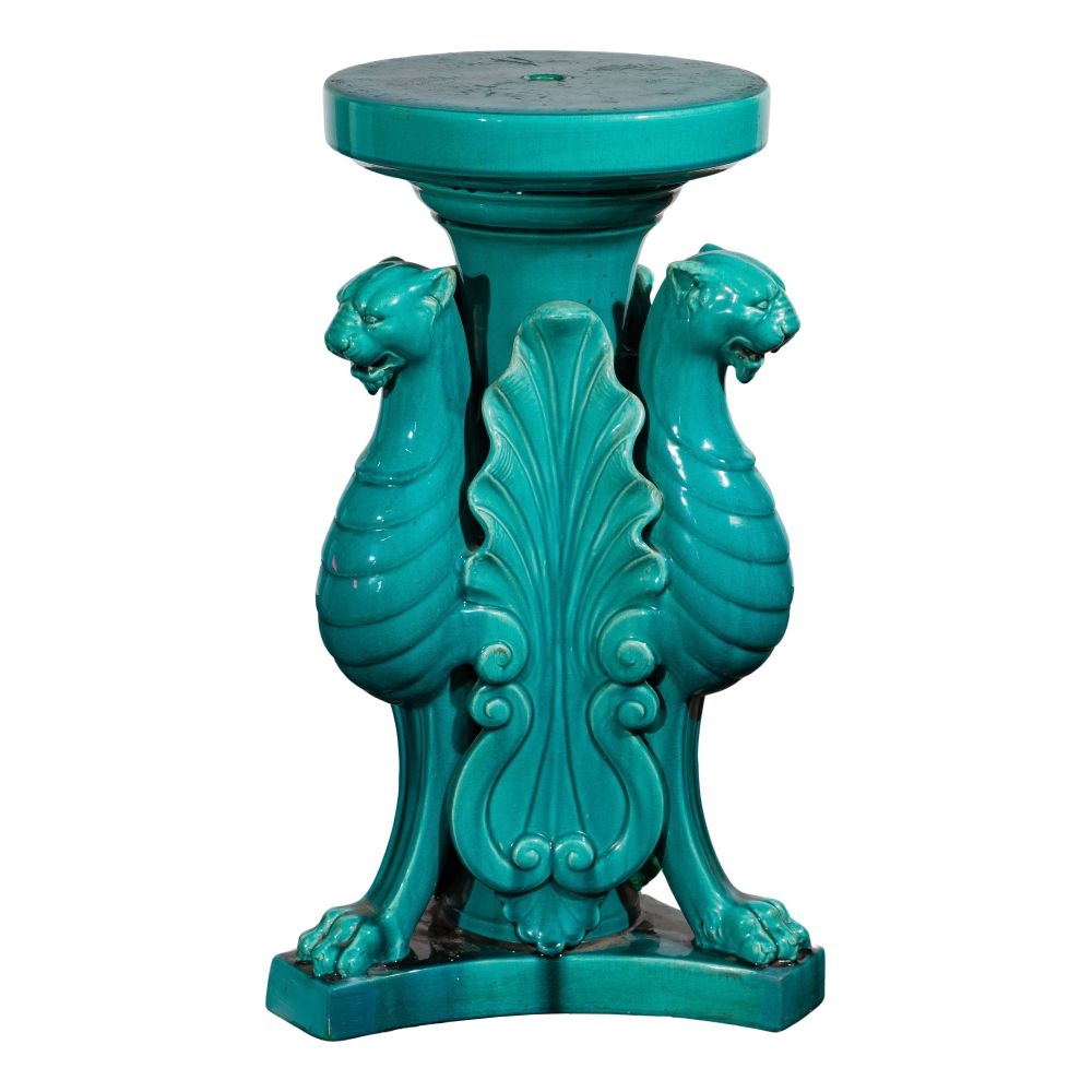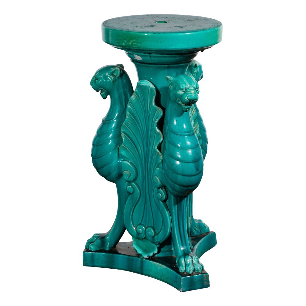 A turquoise stand having three griffins between long acanthus leaves, stamped “Clement Massier, Golfe Juan”