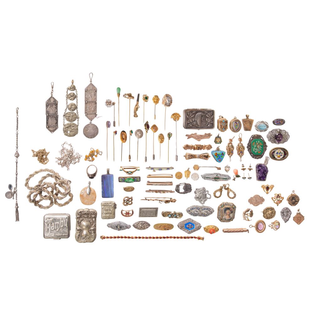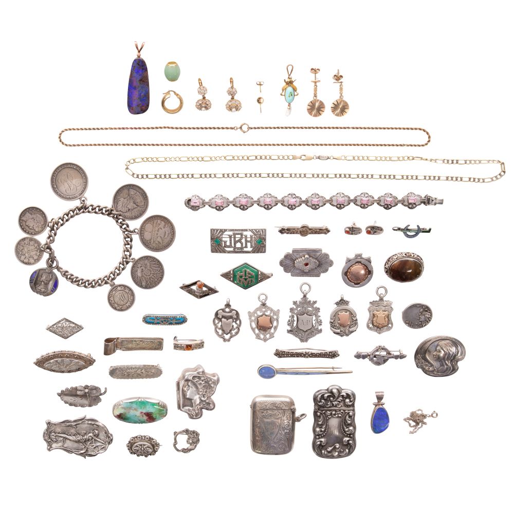 Gold jewelry including a stone pendant, a jadeite jade bead and scrap earring parts (some marked “14k”), a rope chain, a blue gemstone and pearl accent pendant and (2) earring sets (unmarked 10k) as well as silver jewelry including bar pins, school medals, match safes, brooch pins, a figaro link necklace, a blue stone pendant, a pink stone bracelet and a love token coin bracelet (some marked “sterling” / “925”) and costume jewelry including pocket watch hangers, fobs, lockets, stick pins, bar pins, match safes, necklaces, earrings and brooch pins