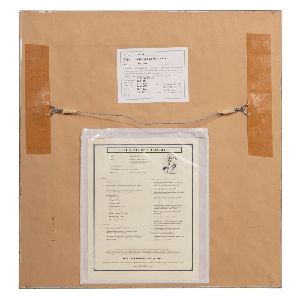 (2) items including an undated, unsigned, from the folio of the Odyssey series, “Banquet at the Palace of Menelaus”, matted under acrylic in a black and gold-tone frame as well as “Bouquet with Hand” Lithograph, 1957, unsigned, from an edition of 6000 printed by Mourlot Freres, Paris, float mounted within mat behind acrylic in a gold-tone carved wood frame having a Martin Lawrence Galleries