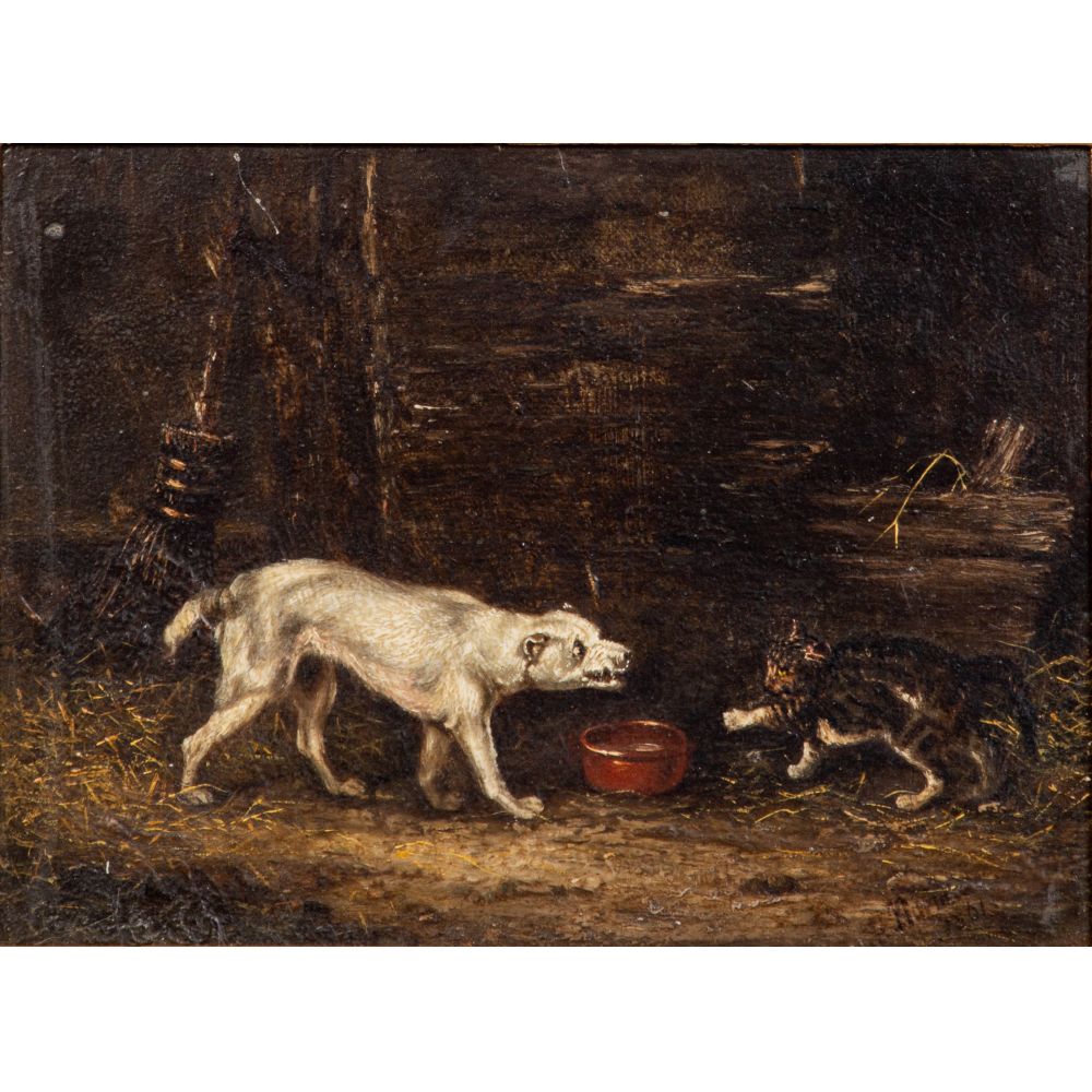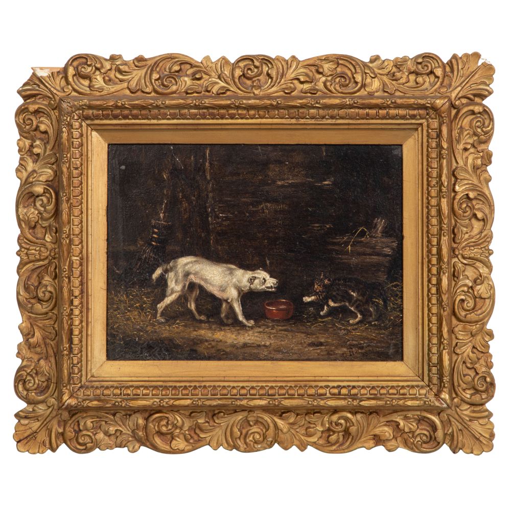 1861, signed lower right, depicting a dog and cat fighting over a dish of food, in a painted gold-tone gesso on wood frame