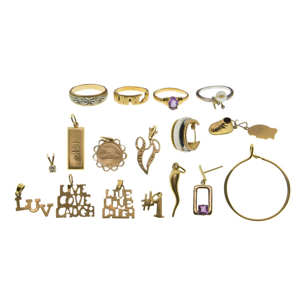 (17) items including (4) rings comprising of an oval amethyst, a pearl having diamond accents, an initial band and a bi-color band, (10) pendants / charms, a pendant / charm holder and (2) single earrings (most marked “14k”)