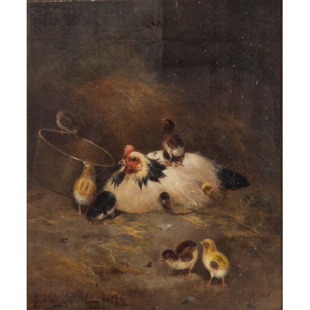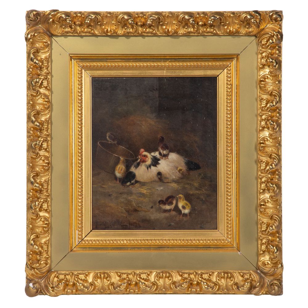 1875, signed lower left, depicting a mother hen and chicks, in a gold-tone gesso on wood frame