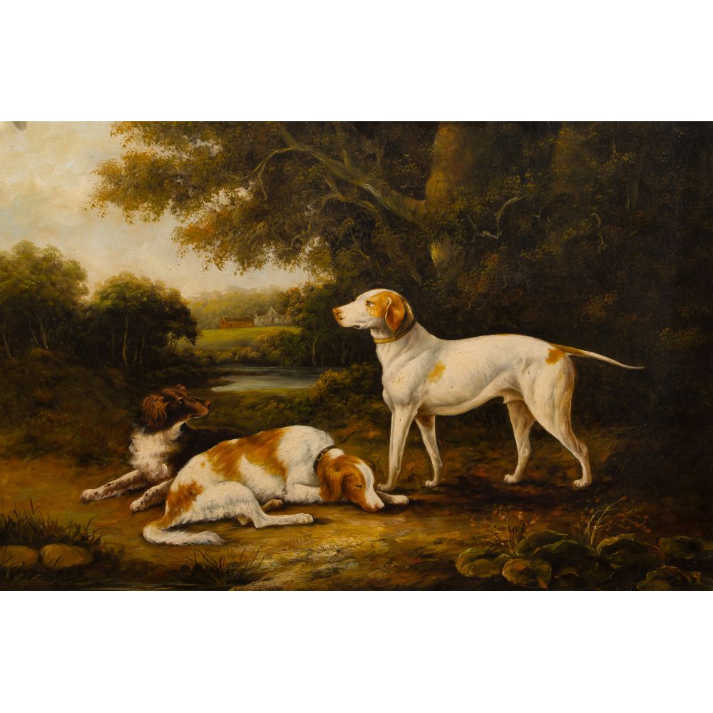 After Charles Henry Schwanfelder (British, 1774-1837) "A Pointer and Two Spaniels" Oil on Canvas